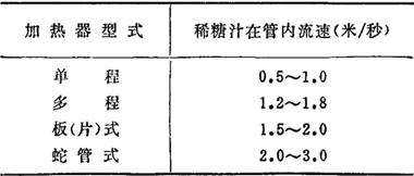 各种型式加热器内稀糖汁流速可自表5-8中选取。