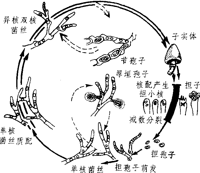 食用菌生活史lifecycle of edible fungi食用菌一生所经历的周期。即由孢子(担孢子或子囊孢子)→单核菌丝→双核菌丝→孢子的生活循环过程。孢子在适宜的温湿度条件下萌发成单核菌丝后,两个同宗或异宗的单核菌丝就进行细胞质融合(质配),形成双核菌丝。双核菌丝进而扭结发育成原基,原基逐渐膨大成菇蕾,最后分化为菌盖、菌柄。处于子实体部位的某些双核菌丝细胞(原子囊或原担子细胞),两核开始合并(即核配)成为一个合子。合子形成后很快进行细胞分裂,一个合子进行一次减数分裂及1~2次有丝分裂,染色体又减半,一个子囊或担子细胞又发育成4或8个单倍染色体孢子。当子实体成熟时,孢子即从子实层上弹射出来,又开始了新的一代。