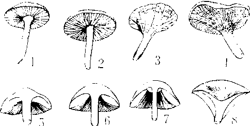 菌褶特征 1.等长 2. 不等长 3. 褶间具横脉4. 交织成网状 5. 直生 6. 弯生 7.离生 8.延生 |