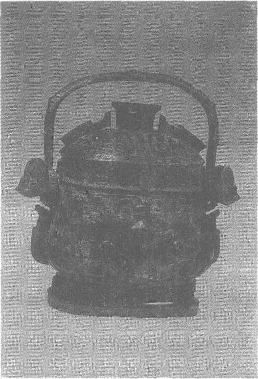 商。通高50厘米,口径12厘米。1982年河南省郑州市向阳回族食品厂出土。河南省文物研究所藏。卣,古代盛酒器。此卣小口,有盖,鼓腹下侈,高圈足,有提梁。盖钮为菌形,有链连于提梁。通体纹饰:钮饰涡纹,盖面饰夔纹,提梁两端为蛇首,颈饰夔纹带,上下夹以雷纹,腹部满饰饕餮纹,圈足上饰雷纹带,夹以联珠纹,有镂孔。二里岗时期青铜器花纹大多为带状,而此卣独为满花,属罕见之例。“二里岗时期”,见“雷纹扁足铜鼎”条目。