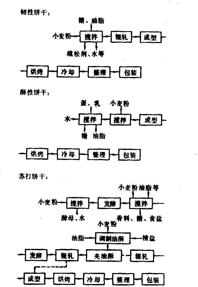 饼干加工biscuit processing用小麦粉和其他辅料,经搅拌、成型和烘烤等工艺制成扁平饼状食品的生产过程。 饼干的种类 主要有: ❶韧性饼干。表皮比较光滑,印纹为凹下的沟槽形,表面有多个孔眼,断面结构有层次,口感松脆,有耐嚼力。常见的有动物饼干、什锦饼干、玩具饼干等,一般为低档的甜饼干。 ❷酥性饼干。与韧性饼干的区别是含油脂、糖比较多,面团韧性差。其外观花纹大多是清晰的浮雕式凸出花纹,表面没有孔眼,比较粗糙,口感酥松。因为它的糖、油含量一般较高,比韧性饼干更加香甜。常见的有椰子饼干、桔子饼干、杏元饼干、椰蓉酥、奶油酥、威化饼干、曲奇饼干等,其形状可采用浇注、挤花、印模成型等方法制得。 ❸发酵饼干。这类饼干的多孔状的酥松组织是靠使用酵母发酵产生的二氧化碳获得的,所以要求面团有较大的弹性,一般糖、油含量较少,断面组织有明显层次,口感松脆。发酵饼干主要包括苏打饼干、粗饼干、椒盐饼干等。其他花色饼干有夹心饼干、蛋卷、Pie、Puff等。 原料和辅料 饼干的主要原料是小麦粉,辅料有油脂、糖、疏松剂、蛋品、乳品、香料和食盐等。此外有些饼干还要添加营养强化剂、淀粉、甜味剂、面团性质改良剂、可可粉、果仁、果核、食用色素等。 韧性饼干和苏打饼干使用湿面筋含量24%~36%的面粉比较合适,而酥性饼干使用面粉的湿面筋含量应在30%以下。常用的淀粉有玉米淀粉、马铃薯淀粉等。糖能增加饼干的风味,还能够抑制面筋在调粉时的形成,使成品具有酥脆的口感,糖还具有能使饼干表皮烘烤时容易上色等功能。有白砂糖、黄砂糖、绵白糖、转化糖浆、淀粉糖浆、果葡糖浆、饴糖等。油脂具有起酥性和较高的稳定性(AOM值应在80以上),主要有起酥油、猪板油、氢化猪油、奶油、人造奶油等。一般天然的植物油起酥性较差,不常使用。添加油脂可使饼干具有酥、松、脆的特点, 还可使饼干具有良好的风味、光泽和更富营养。一般饼干用油量为面粉量的8%~25%。蛋品主要有冰蛋、全蛋黄、冰蛋白等。它可以增加营养价值,改善制品组织使饼干更加酥松。使用蛋量一般不超过4%。常用的乳品有奶油、鲜乳、全脂乳粉、脱脂乳粉、甜炼乳等。除了苏打饼干利用酵母发酵产生的二氧化碳疏松组织外,一般的饼干多使用小苏打(碳酸氢钠)、碳酸氢铵、碳酸铵等疏松剂。小苏打分解缓慢,分解温度也较高,而碳酸氢铵则分解快、分解温度低,而且分解时产生的气体也多,两者混合使用时效果较好。小苏打的使用量一般为0.4%~0.6%,用量过多时会引起制品内部发黄,产生碱味。另外还有以碳酸氢钠为碱性剂与各种酸性剂配制而成的复合疏松剂,也叫发粉,它是通过中和反应产生二氧化碳气体的,因此没有小苏打分解后残留碱的问题。为了软化面筋,防止饼干坯成型困难,可以使用饼干面团改良剂,如焦亚硫酸钠。它对面团的改良既方便又较安全,最大使用量为每千克0.45克,其残留量以二氧化硫计不得超过每千克0.05克。更为安全有效的面团改良剂为木瓜蛋白酶等蛋白分解酶类,它是利用酶对面筋蛋白的分解,来软化面筋的强度,使面团符合加工要求。 生产工艺 韧性饼干、酥性饼干和苏打饼干的工艺流程如图所示。