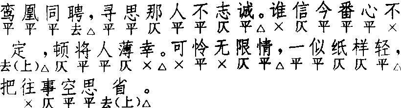 △。此曲见用于《琵琶记·代尝汤药》,叠用二支。《香囊记·供姑》、《双珠记·剑击淫邪》亦均叠用二支,但作法不同:首句四字,有韵有不韵;第二句破为两个五字句,叶韵一平一仄;第三句亦破为两个五字句,下句叶韵;末二句改为四字一句、五字一句,连上两个四字句均不叶韵。《牡丹亭·幽媾》似受其影响,后四句作3