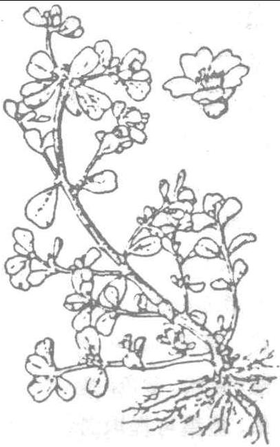 古代名物 > 花卉類 > 草部 > 一二年生 > 馬齒莧 馬齒莧 mǎchǐxiàn 亦稱“馬莧”、“五方草”、“長命菜”、“九頭獅子草”、“㹠耳草”。馬齒莧科,一年生肉質草本。莖直立,紅紫色。葉肥厚,對生,卵狀,基部楔形,全緣。夏季,於枝梢腋間開小花,黄色。蓋果,熟時上部開裂。莖葉可食用,或作飼料,全草入藥。我國廣泛分佈。明·李時珍《本草綱目·菜二·馬齒莧》:“〔釋名〕馬莧、五行草、五方草、長命菜、九頭獅子草。時珍曰: 其葉比並如馬齒,而性滑利似莧,故名。俗呼大葉者爲㹠耳草,小葉者爲鼠齒莧,又名九頭獅子草,其性耐久難燥,故有長命之稱。《寳藏論》及《八草靈變篇》並名馬齒龍牙,又名五方草,亦五行之義。”