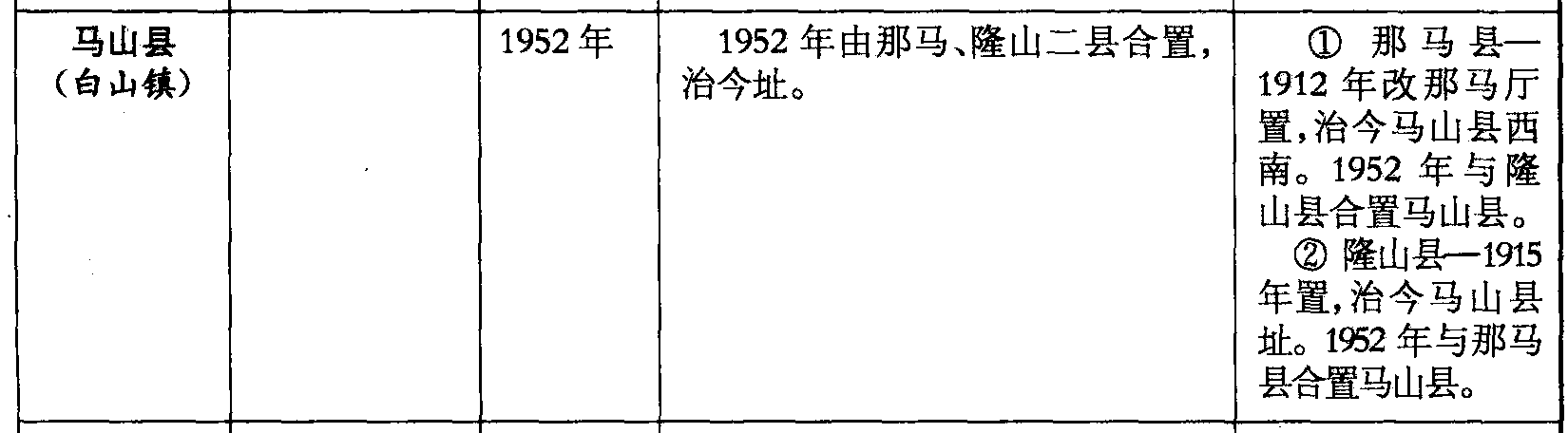 马山县(白山镇)1952年1952年由那马、隆山二县合置,治今址。❶ 那马县—1912年改那马厅置,治今马山县西南。1952年与隆山县合置马山县。❷隆山县—1915年置,治今马山县址。1952年与那马县合置马山县。