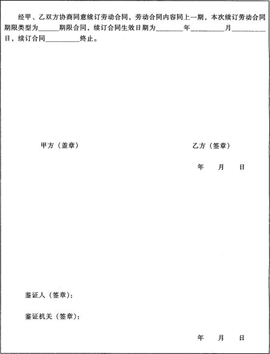 注:续订劳动合同书一式三份:甲乙双方、鉴证机关各一份。