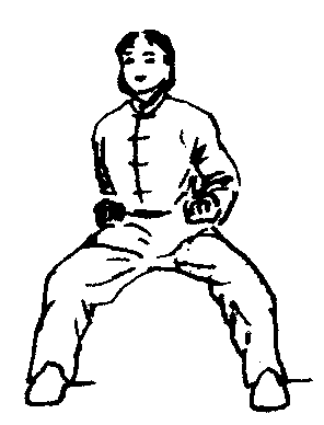 桩功之一。主要练习腿部的力量,使下肢稳固。练习时两脚平行开立,比肩略宽,脚尖正对前方,两腿屈膝下蹲,大腿接近水平,膝部不超过脚尖,全脚着地,重心在两腿之间,挺胸、塌腰,两眼平视前方,气沉丹田,两手抱拳于腰间或两臂环抱于胸前,掌心向外。(图2—4—16)练习时要注意循序渐进,时间逐渐延长,一般1~2分钟即可。