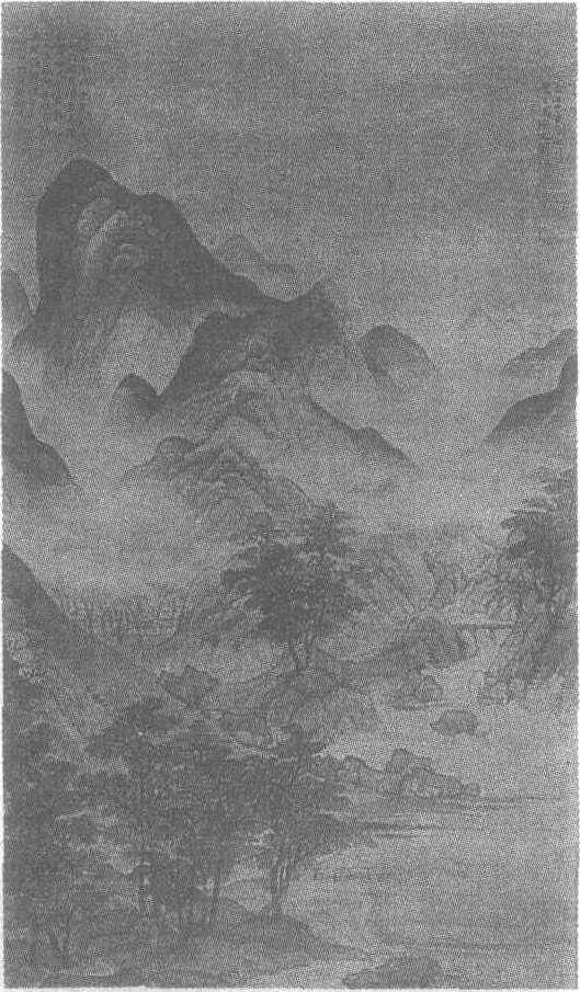 元。马琬(见《马琬雪岗渡关图轴》条目)绘。绢本设色。纵95.6厘米,横56.3厘米。上海博物馆藏。此图描绘黄昏中的湖山景色。近景处坡岸舒缓,林木苍翠。溪流转出山谷,越石穿桥,注入一碧湖水之中。一架小亭临风而立。远景绘起伏连绵的群峰。峰巅树木点点,峰间云雾弥漫,群山脚下房舍掩映,隐约而现,极富诗情。此图中坡石画法师承董源,皴染浑圆沉厚,远山群峰、林木多用水墨横点。全图在水墨勾描皴染的基调上,设淡青色,群峰阳面傅赭色。这些因素和谐地统一在画面上,使得该作品别具风格。此图右上方有其隶书自题:“暮云诗意。至正己丑闰七月望日,马琬文璧作。”下钤<鲁纯生>白文方印,<马琬文璧印章>朱文方印。左上方有四明僧如阜(字物元)所题的一首五言律诗。此图历经明人严宾、清人归希之收藏,著录于《平生壮观》。