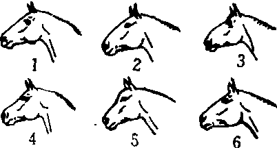 马的头形 1.直头 2.兔头 3.半兔头 4. 凹头 5. 羊头 6. 楔头 |