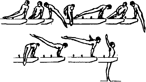 释义 | 马端全旋经侧撑转体360°俯腾越下 马端全旋经侧撑转体360°俯腾越下该动作在鞍马项目中属高难度下法 动作。在60、70年代国内和国际比赛中运动员将此动作较普遍用于鞍马自选动作的下法,80年代以来优秀选手已用经倒立下法取代。由马端后撑开始,重心移至左手,完成德式摆越转体90°,右手撑马端,经马端侧撑部位,双手撑马端挺身转体180°,经面向外马端俯撑部位,身体继续转体,放右手左手支撑挺身转体,身体又经马端侧撑部位,以肩带动身体转体,提臀、展体成右手支撑马端的俯腾越下。动作特点:(1)该动作是属于挺身转体360°的下法动作;(2)动作开始时做一个德式转体90°;(3)挺身转体360°是在马端两手交换4次支撑中完成的;(4)对身体在交换支撑手时维持平衡的控制能力要求较高;(5)从马端开始转体180°经面向外的马端侧撑时,身体位置应具有一定的高度并要有较大的幅度;(6)完成360°经马端侧撑时腿可向下预摆以利随后上摆完成俯腾越下的动作。 ☚ 环上全旋反出马端挺身转体俯腾越下 直接的施托克里A直接反出至马端俯腾越下 ☛ |