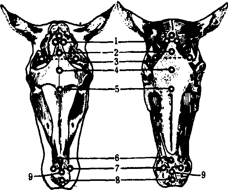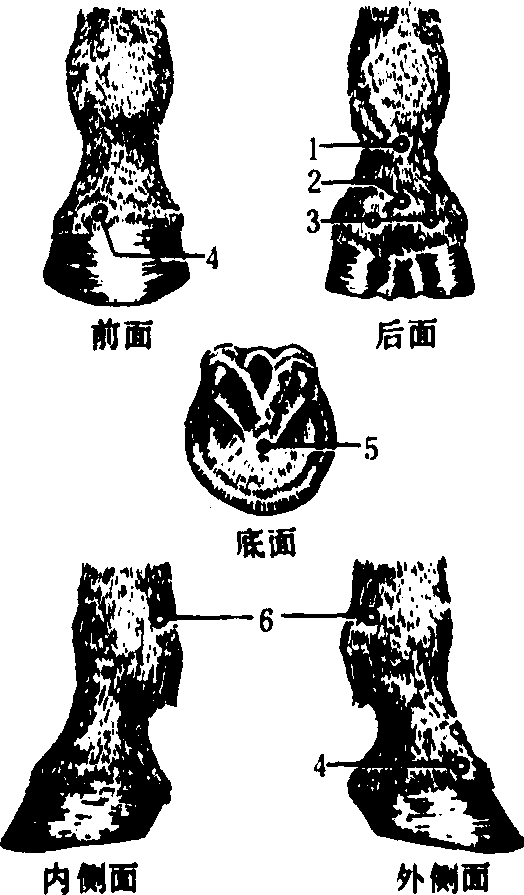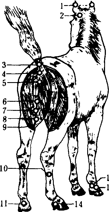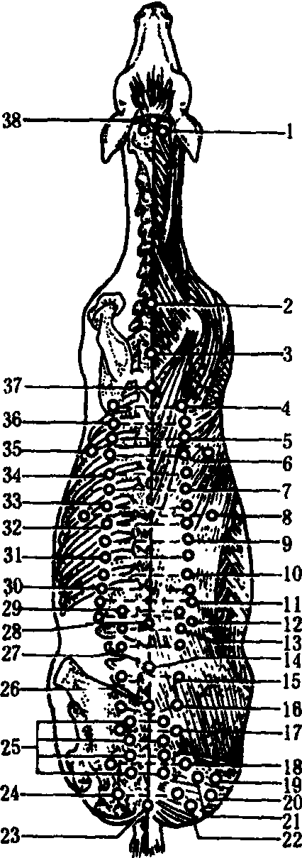 释义 | 马腧穴acupoints of horses对马属动物行针施灸治病的刺激点。现存的古籍中,较系统的马穴位文献资料首见于唐代的《司牧安骥集》,其后是明代的《元亨疗马集》。经过长期的发展积累,现在马体全身各类穴位共计有213个(图1~4),按中兽医通常的体躯分部列穴。 图1 马背侧穴位 马头部穴位 共有穴名65个(正中一穴的5个,其余为左右侧对称取穴)。其中大风门、上关、下关、大眼角、睛明、睛俞、三江、姜牙、分水、承浆、开关、玉堂、通关、耳尖、天门等穴,临证较为常用。三江、大脉、眼脉、太阳、血堂、鼻俞、通关、玉堂等穴为血针;姜牙、松骨、鼻管、槽结等穴为巧治施术部位。耳根、眶孔、面麻、听宫、岩池、颌溪和下翳风等穴是针刺麻醉常用的穴位。此外,神门、小肠、大肠、三焦、胸、腹、肾、交感、大孔、肺、皮质下、治结等穴是近代发展的耳针疗法和耳针麻醉所筛选的新穴。 图2 马头部正面穴位 图3 马后侧面穴位 马躯干部穴位 共有穴名75个(正中一穴的19个,断血一穴三针,左右侧对称取穴的56个,总共133个针灸刺激点)。其中除鹘脉、带脉、尾本和尾尖为血针外,其余各穴多采用毫针或火针。风门、伏兔、九委、鹘脉、大椎、鬐甲、肺之俞、肝之俞、脾俞、关元俞、百会、肾俞、肾角、肾棚、八窖、带脉、穿黄、尾根、尾本、尾尖和后海等穴临证较为常用;百会、断血、鬐甲、中委、肋间一穴、肋间二穴、尾根、尾干等穴常为马针刺麻醉手术所选用。 马前肢穴位共有穴名34个(均为左右肢对称取穴)。其中膊尖、膊栏、肺门、肺攀、肩井、抢风、胸堂、肘俞、前缠腕、前蹄头等穴临证上较为常用。抢风、三阳络、夜眼等穴是针刺麻醉常采用的穴位。 图4 马前肢蹄部穴位 马后肢穴位共有穴名41个(均为左右肢对称取穴)。其中巴山、路股、环中、大胯、小胯、邪气、汗沟、仰瓦、牵肾、掠草、肾堂、阳陵、后三里、后缠腕、后蹄头等穴临证较为常用;肾堂、曲池、鹿节、后缠腕、后蹄门、后蹄头为血针。后三里、环中、路股、巴山等穴被筛选为针刺麻醉的有效穴位。 |