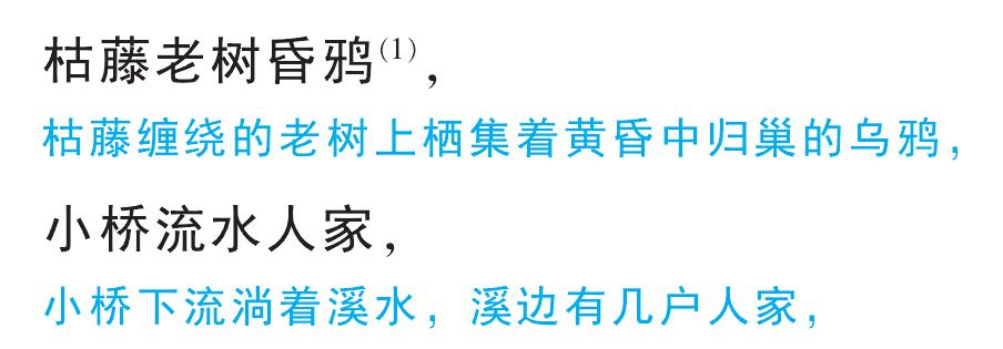 课文导读 马致远 (约1250—约1321), 号东篱, 一说字千里, 大都 (今北京市) 人。 年轻时 追求功名, 曾任浙江行省官吏, 但仕途不畅, 晚年退隐田园, 过 “酒中仙、 尘外客、 林间友” 的生活。 他是元杂剧著名作家, 又是写曲的高手。 马致远编写过十五个杂剧 剧本, 现存七个, 以写昭君出塞题材的 《破幽梦孤雁汉宫秋》 的成就为最高。 他的散 曲创作更是著称于世, 内容广泛, 风格多样。 他创作的散曲数量, 在元代前期散曲作 家中可以说是最多的, 影响也是最大的。 《天净沙·秋思》 是散曲, “天净沙” 是曲牌名, 秋思是题目, 一共只有五句, 写 一个飘零异地的游子在秋天思念故乡, 将秋郊黄昏之景与羁旅行径之愁结合在一起写, 情调比较低沉, 但是艺术上很有独到之处, 是负有盛名的情景交融的佳作。 元人周德 清 《中原音韵》 书中称之为 “秋思之祖”, 近人王国维 《人间词话》 书中誉为 “深得唐 人绝句妙境”。 《天净沙·秋思》 描绘出了一幅秋郊黄昏图, 渲染了悲凉的气氛, 表现了一个长期 漂泊异乡的人的惆怅之情。 曲的第一句中的三种景物, 以 “昏鸦” 为中心; 第二句三 个词, 以 “人家” 为中心; 第三句中的三种景物, 以 “瘦马” 为重点。 离家在外、 到 了天边的断肠人, 看到乌鸦到了天黑的时候还能回到树上去休息, 而小桥流水旁的一 户或几户人家更加勾起游子的思乡之情。 小曲情景交融, 特别是最末一句把曲子的主 题很清楚地表达出来, 仿佛画龙点睛, 顿时给人以强烈的感染, 直抵人的灵魂深处。 另外, 九个名词性词组构成三个句子, 无论是形式上还是内容上都妙不可言。 课文注译 枯藤老树昏鸦(1), 小桥流水人家, 古道西风瘦马。 夕阳西下, 断肠人(2)在天涯。