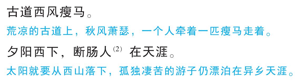 (1) 〔昏鸦〕 暮色迷茫中的乌鸦。 (2) 〔断肠人〕 指漂泊天涯极度忧伤的游子。 马致远《天净沙·秋思》马致远《天净沙·秋思》