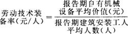 | 释义 | 劳动技术装备率 又称技术装备系数。 指报告期建安企业平均每个工人所分摊的机械设备价值。它是反映建筑业机械装备程度的指标。其计算公式如下: