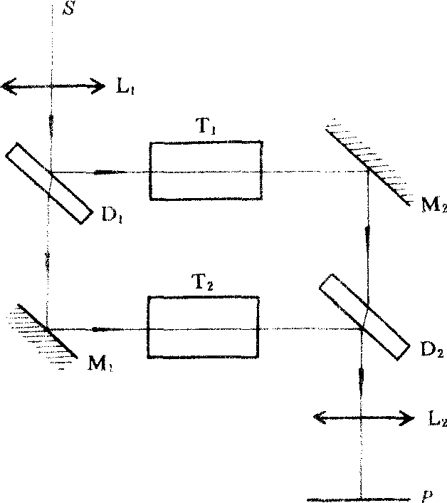 释义 | 马赫—秦特干涉仪 马赫—秦特干涉仪mahe-qinte gan sheyi一种分振幅双光束干涉仪。由马赫和秦特在1892年研制而成。这种干涉仪的原理如图所示。D1和D2为两块分光板,M1和M2为两块平面镜,这四个反射面接近平行,而且它们的中心分别位于一个平行四边形的四个顶点。单色点光源S位于准直透镜L1的前焦面上,S发出的光通过L1后成为平行光,在D1的前表面分成反射光和透射光。反射光被M2反射,透过D2,射向物镜L2;透射光被M1和D2反射,也射向L2。两束光在L2的后焦面P相遇,产生干涉。测量时,将M2和D2稍作倾斜,使视场内只出现几条等距直条纹。这种干涉仪主要用来研究空洞中飞机或导弹模型周围的气流分布。风洞T1和补偿气室T2分别置于两条光路中,气流高速流过风洞中的模型,气流的速度分布形成压力分布,从而影响密度分布,使折射率出现变化,光线的光程也因此发生变化,使干涉条纹也出现变化。根据干涉条纹的照片,就可分析气流的分布。与迈克耳孙干涉仪相比,马赫-秦特干涉仪的光能利用率较高,光只通过每条路径一次,可使干涉条纹位于模型所在的平面上,从而准确定出条纹的位置。若使用激光作光源,还可获得清晰而明亮的干涉图样。 ☚ 迈克耳孙干涉仪 泰曼干涉仪 ☛ |