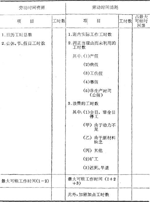 释义 | 劳动时间平衡表 反映企业在一定时期内劳动时间的资源和消耗的平衡关系的表式。 不论资源和消耗都应按性质分组,以便分析原因,挖掘劳动时间的潜力,提高工时利用。 劳动时间平衡表的基本构成为: 劳动时间平衡表 平衡表左方最大可能工作时间即制度工时总数,按工作班数及每班工作时间计算,如果各类工人制度工作日长度不同,应分别计算汇总。 平衡表右方劳动时间消耗,可根据具体要求作不同的分组,以利分析研究。 |