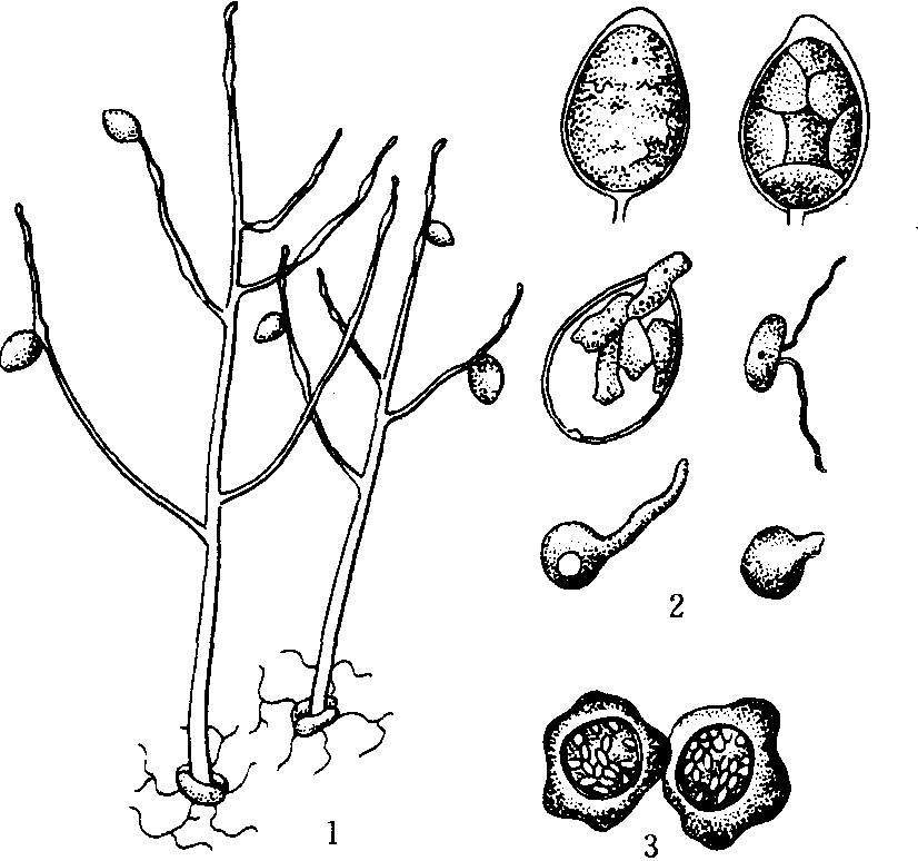 侵染过程和病害循环 病菌以休止孢子萌发的芽管从气孔或表皮侵入,在寄主细胞间隙中发展成菌丝,以吸器伸进细胞内吸取养分。致病疫霉除卵孢子外不能在土壤或病残组织中长期存活和耐严冬的低温,但有形成厚垣孢子存活3个月的报道。在一年一作地区冬季漫长,晚疫病的初侵染源为发病而不严重的薯块,收藏入窖而越冬。来年的和健薯一起播种到地里,病菌随温度转暖而活动,沿着幼苗的茎秆长到地面。气候温暖潮湿在地上或地下的病斑上长出孢子囊侵染叶片与邻近的健苗,经过几次再侵染形成一定数量的病株病叶后成为发病中心才被发现。此时若气候继续潮湿,短期内全田发病。西南地区由于冬季较温暖和有马铃薯植株存在,且多雨潮湿,加上有垂直分布的多种种植制,晚疫病能在早期发生,侵染源不限于本田的病薯。晚疫病的流行主要由温湿度是否适宜与持续时间的长短及品种的抗病性而定。据1951~1961年11年中国张家口地区的资料统计,发病严重的6年中,6、7、8三个月的降雨在200毫米以上,而且连续三年旬相对湿度达到75%以上,高湿旬次数愈多,病害愈严重。病菌传播距离主要在初侵染源附近,但不排除少数能传到几公里以外。 病害控制 马铃薯晚疫病的防治应采取以农业防治、加强栽培管理和药剂保护相结合的措施,主要有三方面。❶选用抗病品种。中国已育出上百个抗病品种,大大减轻了晚疫病的威胁。 ❷减少菌源。首先要从无病留种开始。留种田除严格进行化学保护外,还应增高培土,注意排水,防止病菌随雨水渗入土中侵染新薯。提倡割蔓晒地两个星期后收获,在入窖、播种前淘汰并处理好病薯。 ❸化学保护。根据气象条件和发病中心的出现进行晚疫病流行的预测预报,及时对发病中心附近及低洼地进行化学防治,逐步扩大范围。喷药次数因药剂种类和气象条件而定。药剂种类有波尔多液、代森锌、代森铵等保护剂和内吸杀菌剂瑞毒霉等。 马铃薯晚疫病potato late blight马铃薯的一种重要真菌病害。广泛分布于世界主要马铃薯产区。病原菌是鞭毛菌亚门的致病疫霉菌〔Phytophthora in-festans(Mont.)de Bary〕。危害叶、茎和块茎。病叶初现水渍状小斑,后扩大为褐色病斑,田间湿度大时变成黑色湿腐,病斑和健康部分的界限不明显,周围黄绿色,叶背病斑产生白色霉层(孢囊梗及孢子囊)。有时病斑扩展到叶柄和茎秆上。病薯表面出现褐色或紫褐色凹陷病斑。土壤潮湿时病斑可深入内部,干燥时表面病斑变硬。病菌也侵害番茄的叶和果实。病菌寄生专化性强,可划分成许多生理小种。病菌主要以菌丝体在病薯内越冬。病薯播种后可在田间形成中心病株,产生孢子囊借气流和水流传播并不断再侵染。潮湿、凉爽、多雾、多露或阴雨天气有利于病害蔓延。品种间抗病性差异明显。可采取选用抗病品种、种植无病种薯和喷洒菌剂等防治措施。 马铃薯晚疫病症状 马铃薯晚疫病由马铃薯晚疫病菌引起的马铃薯病害。各个部都可被染,尤其是叶部。马铃薯感病阶段主要为现蕾开花期,若48 h内气温在10℃以上,相对湿度在75%以上,15~22d后便会出现中心病株,若条件适宜,10~14d就会蔓延全田。防治主要采取4类措施:选用抗病品种、无病种薯,消灭中心病株、改善栽培管理。使用药剂有:1%~2%的硫酸铜,50%敌菌灵、75%百菌清、50%福美双等。 马铃薯晚疫病由致病疫霉菌(Phytophthora in-festans)侵染引起。主要危害叶和块茎。叶部常发生在叶尖或叶缘,开始呈水渍状小斑,后扩大呈圆形或半圆形暗绿或褐色病斑,且病健交界处有白色稀疏的霉轮,叶背尤明显。天气潮湿扩展迅速,受害块茎表面呈淡褐或灰紫色微凹陷的不规则病斑,病斑下面的薯肉呈深度不同的褐色坏死部分。在适温下,温度越高,孢子囊形成越多。防治方法:选用抗病品种;利用早熟品种可以避病;在田间出现中心病株后,及时喷药延缓病害的蔓延。 马铃薯晚疫病 马铃薯晚疫病一种发生普遍、流行速度快、危害严重的马铃薯病害。病原为晚疫病菌属藻状菌纲的疫霉菌。成熟的病菌孢子囊在水中很快萌发,形成双鞭毛游动孢子,在水中游动片刻后脱去鞭毛产生重芽管,即可侵入寄主在气温15℃以上时, 孢子囊常常不形成游动孢子,而直接产生芽管。感病马铃薯叶片的叶尖或叶缘呈现青褐色水渍状斑点, 在潮湿的环境下,迅速扩大为黑褐色斑点,并在病斑边缘生出一圈白色霉状物, 即病菌的孢子梗和孢子囊(天气干旱时,病斑干枯变为褐色,不产生白色霉状物。但将病叶连同叶柄摘下,插入容器内的湿沙上,然后在容器上加盖,保湿一天左右,病斑处即生出白色霉状物)。感染病的薯块,表面出现稍凹陷的褐色或紫褐色的病斑(洗净薯块,从病斑处切开,切面向上放入容器,保湿2~3天,在接近病斑处的切面上便呈现出白色霉状物),斑下的薯肉变为褐色;薯块煮熟时,病斑处为硬块。防治法:(1)选用抗病品种。目前推广的抗病品种有抗疫1号、大红眼窝、四斤黄, 长薯4号、反帝号、反修号、跃进1号、胜利1号、白如雪、临薯1~6号、农大1号等。(2)选用无病种薯:带病种薯是病菌初侵染的主要来源。要仔细选择无病薯块留种,单窖贮藏;种薯出窖时再行严格精选,淘汰有病的、可疑的和有伤口的种薯。建立无病留种地是解决无病种薯的有效途径。(3)种子处理: 播种前用温汤处理种薯, 即先将种薯在40~56℃的温水中预浸1分钟后, 移入60℃的温水中(种薯与