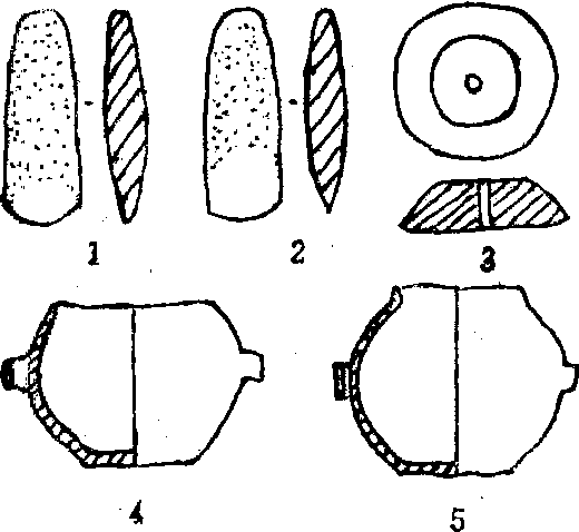 释义 | 马鞍山遗址属青铜时代西团山文化遗存。位于吉林省吉林市郊区白山乡鸡冠山大队吉桦公路东侧一座东高西低中间凹下的山上,故名。东南山头海拔291米,西北山头海拔284米,遗址座落在西北山顶和四面山坡之上。这里的地理环境是: 东面隔山谷与起伏连绵的山岗相连,西面山麓临三家子小河,南面是一片漫岗耕地,北面是开阔的冲积平原,约四公里许为松花江流。马鞍山遗址四面山坡都有人工削成的阶梯状台地,级数不等,东坡三级,西坡十级,台地一般长10—30米,宽5—10米左右。有的台地上还隐约可见居住址坑。山顶为一平台,长30、宽25米许。山顶平台和东南山坡已开为耕地。在耕地上散布许多素面夹砂陶片和少量磨制石器,在未开辟耕地的山坡台地上,也可拣到石、陶遗物。显然,这里是古代人们的居住区。在西南山坡山腰和山脚,于冲沟内暴露出三具石棺墓,其中有两具只存部分壁石,有一具壁石与盖石皆在,附近并有一些陶器残片,显然是被破坏的石棺中的随葬陶器的残片,可知这里是墓葬区。居住址和墓葬地总面积约六千平方米。在马鞍山遗址采集的石、陶遗物标本共45件,其中有石斧、石刀、石锛、石凿、敲砸器、砍砸器、陶纺轮、陶网坠、鼎足、器底、器耳、口沿和经火烧过的陶泥等。此外,还在群众手中征集到在墓葬中出土的两件陶罐(见图)。这个遗址的文化面貌同附近几处遗址相同,分布又比较集中,可能意味着当年马鞍山、两半山、小团山、小西山以及小白山等地的人们属于同一个氏族部落联盟。 (1.2石斧,3陶纺轮,4.5陶罐) |
