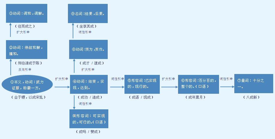 释义 | 成 1 ★★★ 00059名![]() 完成;做成功: 这事能~,多半靠大伙出力|经过努力,终于大功告~|~事不足,败事有余。 败 bài 成者为王,~者为寇|成也萧何,~也萧何|不论成~,只要努力过就可以了。 吹 chuī 这次可能又要~|虽然彼此都有诚意,这事最后还是~了。 ❶完成;成功(跟“败”相对)。可带“了”“过”。作带宾、带补谓语。 那个一点也不引人注意的小伙子终于~了大事|~了一门亲事|他办的事没~过一回|我担心实验~不了|你先去办,事情~不了的话,咱们再商量|功到自然~。 ❷成为;变为。可带“了”。作谓语,必带名词宾语,可带补语。 ~问题|~了典型|~专家|我的三个学生都~了战斗英雄|这一带已经~了住宅区|冰一加热就~了水|不勤奋就永远~不了才|~不了气候。 ❸可以,行或表示应答。可带“了”。 a.作谓语,用于句末。 你的橡皮借我用一下~不~|这件事他去办准~。 b.用在句首,作独立成分, ~,就这么办吧!|~,文件就放在这儿吧! ❹表示达到一个单位(强调数量多或时间长)。与量词构成词组用在句子里,作相应的成分。 a.作谓语。 桌上文件~堆|牛羊~了群|~千上万|~群结队|~年累月|~千累万。 c.作状语,可重叠。 产量~倍地增长|各种化肥~吨~吨地运往农村|粮食~车~车地运往灾区。 能干。前面必加“真”,不常用。作谓语。 他可真~|这个乒乓球队可真~,又打赢了! (~儿)1/10叫一成。常跟“一”“二”“三”……“十”组合起来作相应的句子成分。 a.作宾语。 村里今年收获的庄稼比去年增长两~。 b.作主语。 三~就是3/10。 c.作定语。 做这件事,他只用了六~功夫。 【反】 〈动〉❶败 【词语】 成败 成本 成材 成虫 成丁 成方 成风 成服 成个儿 成规 成婚 成活 成家 成见 成例 成殓 成龙配套 成眠 成名 成命 成年 成品 成气候 成器 成亲 成全 成人 成人之美 成仁 成日 成色 成事 成数 成说 成算 成套 成天 成文 成心 成型 成药 成衣 成议 成因 成语 成员 成约 成竹在胸 字源解说 成,甲骨文 ![]() ![]() ![]() ![]() ![]() ![]() ![]() ![]() ![]() ![]() ![]() 附 文言版《説文解字》:成,就也。从戊丁聲。 ![]() 附 白话版《说文解字》:成,实现,完成。字形采用“戊”作边旁,“丁”作声旁。 ![]() 引申线索 ![]() 【字族索引】 成 【同音字】 chéng |