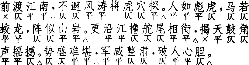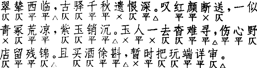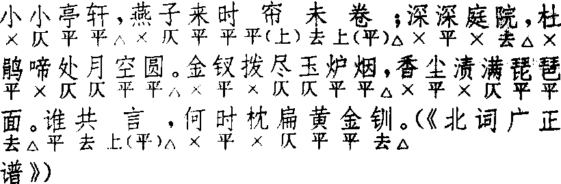 释义 | 驻马听 驻马听词牌名。双调九十四字,上阕六平韵,下阕四平韵。又曲牌名。南北曲均有。北曲较常用,一般用在双调套曲中,字句格律与词牌略有不同。 ☚ 满江红 六幺令 ☛ 驻马听 驻马听李好古 “落花满地”套 ![]() 全曲八句:4△,7△;4△,7△。7△,7△。3△,7△。《中原音韵》“作词十法”谓:“扇面对:〔驻马听〕起四句是也。”首四句作两排,第一、二句对第三、四句。第五、六句亦须对。第七句平仄可不拘;亦有作四字句者,如关汉卿《单刀会》“大丈夫心别”,马致远《岳阳楼》“欠人债负”,汤式“十年无梦”套“撚断吟髭”,无名氏“闲风吹散”套“若道伤春”。《北曲新谱》谓:“第三第六及末句应叶去声韵方起调,上声韵是第二着。”蒲察善长“楼头画鼓”套第三、四句均变为上三下四式七字句,无名氏“闲风吹散”套第二、四句均变为六字折腰句,皆为孤例。白朴小令四支、郑德辉“败叶将残”套二支,第一、三句皆不叶韵。郑德辉“败叶将残”套首牌〔驻马听近〕,于第一、三句不叶韵外,又改末二句为三个三字句,并作鼎足对;其〔幺篇〕换头又减去第一、三句。白、郑之外,未见他作。套数次牌。小令兼用。与词牌异。与南〔中吕〕有异。 ☚ 五供养 沉醉东风 ☛ 驻马听 驻马听洪昇 《长生殿》 ![]() 全曲九句:4△,7△。4,4,4△。7△,7△。4△,7△。 其二 徐复祚 《投梭记》 ![]() 全曲十句:4△,7△。4,4,4△。7△,7△。4△,4,4△。第一式末句七字,第二式破为两个四字句,此外全同。《南词简谱》只收第一式,并谓:“末句有作八字两语者,如《荆钗记》云:‘一朝契合,做百年姻眷。’《寻亲记》云:‘早寻见一日,免得一日煎熬。’是为别体,不妨并列。”今查《荆钗记·受钗》四支,末句皆作四字二句,又“团圆”六支,七字句与四字二句各半;《杀狗记·王婆逐客》一支四字二句,又“孝友褒封”一支七字句:二体固皆同时并用。早期南戏《张协状元》第二十一出三支,《小孙屠》第九出四支,末句皆作七字句,是知四字二句,乃后起作法。〔驻马听〕叠用多支成套,如《浣纱记·问疾》五支,《荆钗记·团圆》、《娇红记·仙圆》六支。亦有单用一支者。小令常用。与词牌不同。与北〔双调〕略同。以〔驻马听〕为主的集曲有〔马蹄花〕、〔驻马泣〕、〔金马乐〕、〔倚马待风云〕、〔驻马摘金桃〕、〔驻马听黄莺〕、〔驻马古轮台〕、〔番马舞秋风〕,见《南词简谱》。 ☚ 尾犯序 驻云飞 ☛ 驻马听 驻马听见宋柳永《乐章集》,入林钟商(夷则商)。《词律》卷一三、《词谱》卷二三俱列其“凤枕鸳帏”一首,双调,九十四字,上片十句六平韵,下片九句四平韵。此调宋词仅见此首。 ☚ 孤馆深沉 九画 ☛ 驻马听 驻马听曲牌名。南曲属中吕宫,多用作引子。北曲属双调,较常用。字数定格及韵式据清·周祥钰《九宫大成谱》作四、七、四、七、七、七、三、七(八句)。与词牌不同。一般用在双调套曲中。如元杂剧《单刀会》第四折关羽乘船观江景、怀念往事时所唱。曲调雄壮,以唢呐伴唱。 ☚ 新水令 驻马听近 ☛ |