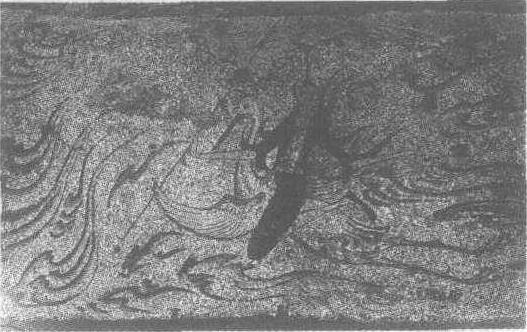 高句丽(公元6世纪)。纵50厘米,横90厘米。吉林省集安县四神墓藻井西南第一重抹角石上壁画。仙人梳高髻,髻上戴饰物。身着绛色对襟羽衣,裤仅及膝,右手持长矛,侧身回首坐于仙鹤之上。仙鹤双腿后平伸,振翅飞翔,四周环以流云。仙人神态超脱,“仙气”横溢,在仙鹤的背负下畅游云间。此图绘画水平较高,笔调轻松,线条流畅,其风格与所绘内容十分吻合,且有极强的动感,是高句丽壁画作品中的优秀之作。