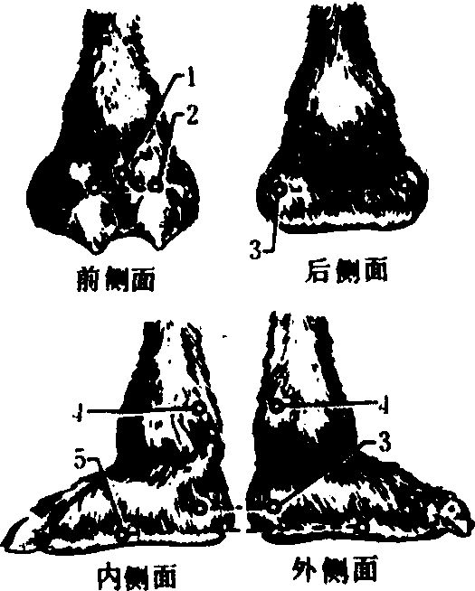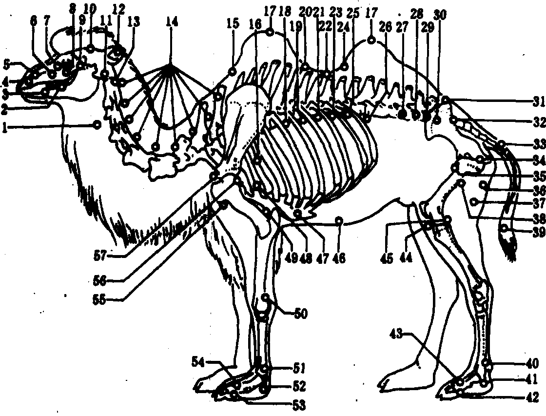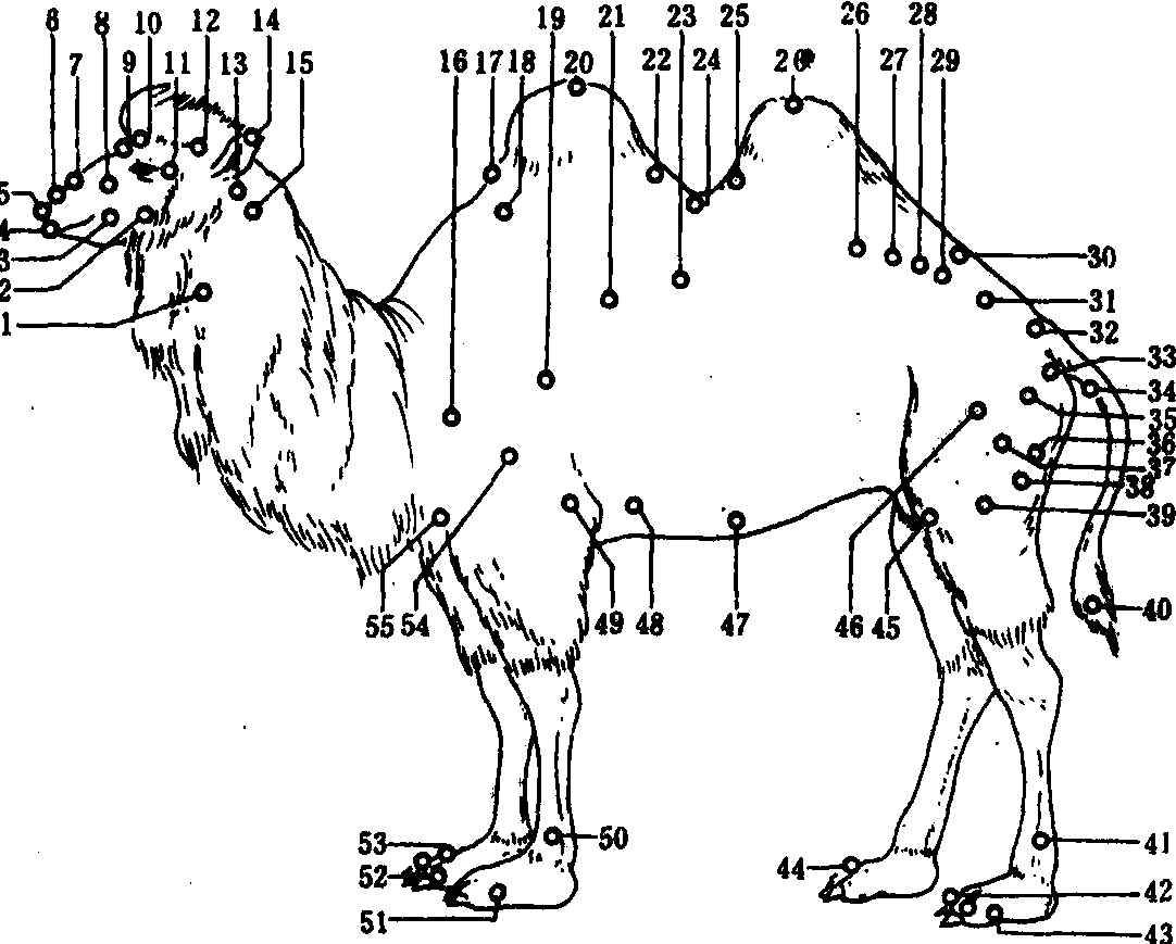 释义 | 骆驼腧穴acupoints of camel对骆驼行针施灸治病的刺激点。见《中兽医针灸学》。常用穴位,头部18穴,躯干31穴,四肢31穴,共计80穴(图1~4)。 图1 骆驼体表穴位 大风门(dafengmen) 共三穴,中间一穴位于枕嵴前下方约12厘米处的额嵴部,另两穴在正中穴前下方旁开4.5厘米处。火针由上向下平刺入6厘米,或火烙。主治项强腰直或其他风证。 龙会(longhui) 又名通天或顶门。额部正中,两外眼角连线中点的凹陷处,一穴。火烙。主治破伤风、项脊恡、脑黄。 鼻缺(bique) 两鼻孔之间的鼻尖处,一穴。烧烙。主治癫痫。 分水(fenshui) 又名命牙。嘴唇上,两鼻孔下,唇沟正中,一穴。小宽针直刺1.5厘米。主治冷痛、黑汗风。 内唇阴(neichunyin) 上唇粘膜面的血管上,左右侧各一穴。小宽针散刺出血。主治胸痛、心、肺和脾积热。 通关(tongguan) 舌底两侧血管上,左右各一穴。将舌拉出,翻转舌体,用小宽针刺破舌下血管,出血。主治舌疮、心脾肾积热、肚痛。 三江(sanjiang) 内眼角前下方约6厘米处的血管上,左右侧各一穴。小宽针直刺1厘米,出血。主治肚痛、翳膜遮睛、睛生瘀血。 血堂(xuetang) 鼻孔上方、距鼻孔上缘6厘米处,下鼻甲骨部的鼻粘膜上,左右侧各一穴。小宽针刺破下鼻甲骨,主治鼻肿痛。肺热喘粗。 鼻俞(bishu) 又名气海。鼻孔上方3厘米处,左右侧各一穴。小宽针直刺2厘米,出血。主治五脏积热、消化不良。 锁口(suokou) 口角后3厘米处,左右侧各一穴。火针直刺3厘米,或烧烙。主治口眼歪斜、牙关紧闭。 开关(kaiguan) 口角后上方的咬肌前缘凹陷中,左右侧各一穴。火针直刺3厘米,或烧烙。主治口眼歪斜、牙关紧闭。 眼脉(yanmai) 外眼角后下方6厘米处的血管上,左右侧各一穴。小宽针或中宽针顺血管刺入1厘米,出血。主治肝经风热、睛生翳膜。 大眼角(dayanjiao) 内眼角内,第三眼睑内侧凹陷中。左右侧各一穴。毫针或圆利针向内下方刺入2~3厘米。主治眼病、肚痛。 骨眼(guyan) 内眼角内,第三眼睑的外上缘,左右侧各一穴。小宽针刺破第三眼睑,或沿外上缘剪去一小部分。主治肝经风热、闪骨生瘀。 睛明(jingming) 内眼角下的外侧皮肤褶上,即在下眼睑的泪骨上缘凹陷处,左右侧各一穴。小圆利针直刺1厘米,或在下眼睑内侧粘膜部点刺出血。主治流泪、眼内生疮。 耳尖(erjian) 耳的尖端,左右耳各一穴。小宽针直刺1厘米。主治肚痛、感冒、头肿、耳内生疮。 耳姜牙(erjiangya) 耳根前方的盾状软骨上,左右侧各一穴。小宽针刺透软骨。主治肚痛、消化不良。 风门(fengmen) 又名小风门。耳后下方1.5厘米,寰椎翼前缘的凹陷处,左右侧各一穴。火针向下直刺1~2厘米。主治破伤风、脑黄、项脊恡。 伏兔(futu) 耳后寰椎翼后上缘的凹陷中,左右侧各一穴。火针直刺3厘米。主治破伤风、脑黄、项脊恡。 九委(jiuwei) 分为上上委、上中委、上下委、中上委、中中委、中下委、下上委、下中委、下下委等九穴。上上委在鬣毛下项韧带下方,距耳后9厘米处;下下委在肩胛软骨前角前4.5厘米处;两穴之间划分成8等份,即为其余七穴,左右侧各九穴。火针直刺3厘米。主治项脊恡。 鹘脉(gumai) 又名颈脉。下颌骨颈角后缘约7厘米处的颈静脉上, 左右侧各一穴。大宽针顺血管刺入1厘米, 出血。主治脏腑积热。 嗓黄(sanghuang) 颈下气管腹侧部正中第二、三气管轮之间, 一穴。小宽针穿过, 或由两侧各刺入1厘米。主治嗓黄。 图2 骆驼的骨骼及穴位 前峰(qianfeng) 前峰正前基部的凹陷处, 一穴。火针或圆利针直刺3厦米, 毫针直刺6厘米。主治项脊恡、前肢风湿。 峰尖(fengjian) 峰顶端的脂肪结缔组织内, 前、后峰各一穴。火针或小宽针直刺3~6厘米。主治水囊积热、不食。 丹田(dantian) 由两峰中间处向前数的第二个凹陷处, 刺入第八与第九胸椎棘突之间, 一穴。火针直刺3厘米。主治肚痛、腰风湿。 脊俞(jishu) 两峰正中间的凹陷中,一穴, 即在第十与第十一胸椎棘突之间。火针直刺1.6厘米,小宽针直刺3厘米。主治腰胯疼痛、风湿症。 带脉(daimai) 胸侧壁, 肘后6厘米处的胸外静脉上, 左右侧各一穴。中宽针顺血管直刺1厘米, 出血。主治脾经积热、肠黄、消化不良。 云门(yunmen) 脐前3厘米,距白线旁约1.5厘米处, 左右侧各一穴。大宽针刺破皮肤, 向上插入宿水管。主治宿水停脐。 肺俞(feishu) 倒数第五肋间, 距脊梁约24厘米处,髂肋肌沟中,左右侧各一穴。火针直刺3厘米。主治肺痛、肺寒、咳嗽。 肝俞(ganshu) 倒数第四肋间、距脊梁约24厘米处, 髂肋肌沟中, 左右侧各一穴。火针或圆利针直刺3厘米。主治黄疸、肝虚、眼病、脾胃虚弱。 脾俞(pishu) 倒数第三肋间、距脊梁约24厘米处, 髂肋肌沟中, 左右侧各一穴。火针或圆利针直刺3厘米。主治脾寒、肚痛、肚胀、慢草。 胃俞(weishu) 倒数第二肋间,距脊梁约24厘米处, 髂肋肌沟中, 左右侧各一穴。火针或圆利针直刺3厘米。主治脾胃虚弱、积食、泄泻、腹痛。 大肠俞(dachangshu) 倒数第一肋间,距脊梁约24厘米处,即背阔肌深部, 髂肋肌沟中。左右侧各一穴。火针或圆利针直刺3厘米。主治便秘、肚胀、积食、泄泻。 关元俞(guanyuanshu) 第十二肋骨后缘与第一腰椎横突游离端之间。左右侧各一穴。火针或圆利针直刺3厘米。主治便秘、肚胀、积食、泄泻。 膀胱俞(pangguangshu) 第二、三腰椎横突之间的凹陷中, 左右侧各一穴。火针或圆利针向背中线刺入3~4厘米深。主治泄泻、腰肌风湿症。 百会