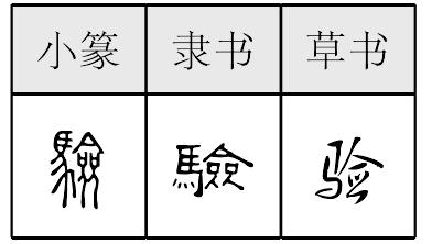 yàn驗,形声,从馬,僉(qiān)声,本义为马名,假借为考察、检验,由此引申为证据、有效、预期的结果等。《简化字表》类推简作“验”。 |