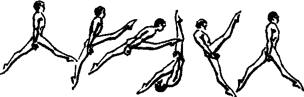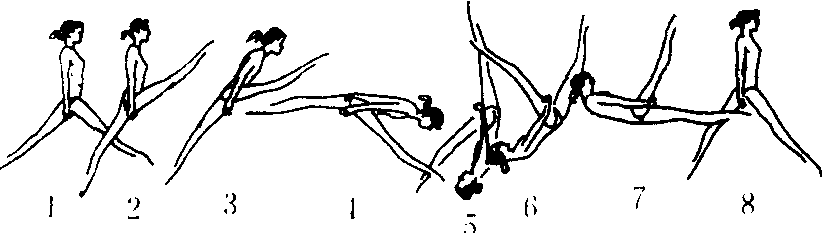 释义 | 骑撑前回环 骑撑前回环单杠简单回环动作之一,也是体育院系体操普修教学大纲内容。技术要点:由反握骑撑姿势开始,右腿举起,直臂下顶,提高重心位置。随即杠子紧靠左大腿,右腿向前远方跨伸,挺胸前倒进行回环。当肩轴经杠下垂面继续上升时,右腿向杠前下伸,并以大腿压杠进行制动,同时直臂转腕上成左腿后控的骑撑姿势。初学时保护者位于杠前,托其右腿,体会右腿远伸、挺胸前倒技术要领。然后可在助力下直接练习。保护者位于杠后侧,一手由杠下握其手腕,另一手托背助其上成骑撑。 ☚ 正反握悬垂前摆转体180°成支撑 骑撑后回环 ☛ 骑撑前回环 骑撑前回环高低杠简单动作之一。在50年代时尚有人编进成套动作,现早已因过于简单而淘汰,难度表上也早已取消。动作要领:由右腿在前,左腿在后的分腿反握骑撑开始,撑起身体以提高重心,举腿向前跨出,然后向前倒肩,左大腿前侧靠杠,做向前回环,当回环至杠下垂直部位后右腿向前上方穿腿,肩回环至水平部位后立肩翻腕成骑撑。回环时右腿要向前分大,使身体重心远离支撑点,以便加快回环的速度。这个动作还可以加转体,也可以换握高杠成骑撑仰卧悬垂。加助力时教练员站在杠后运动员一侧,一手从杠下握住其手腕,另一手在运动员回环接近支撑时托其背部。 ☚ 手握高杠,低杠仰卧悬垂弹杠翻上成高杠支撑 骑撑前回环换握高杠 ☛ 骑撑前回环 骑撑前回环骑撑,利用摆腿倒上体围绕单杠向前旋转1周。动作要领:由两手反握杠、右腿在前骑撑开始。直臂顶肩撑杠,同时右腿向前跨出,左大腿前上部靠杠,上体挺直前倒。当身体回环接近杠后水平部位时,右腿向前下方压杠,展髋,左腿继续后摆,同时挺胸、直臂压杠,翻腕上成骑撑。保护与帮助:保护者站在杠后侧方,一手从杠下翻握他的手腕,另一手当练习者回环过杠下垂直部位后,托其背部助其上成骑撑。教学重点:帮助者站在杠前,用手抵住练习者的前脚,使其体会撑杠、向前跨腿、上体前倒技术的配合,然后在帮助下做完整练习。 骑撑前回环 ☚ 回环 骑撑后回环 ☛ |