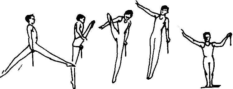释义 | 骑撑前腿向后摆越转体90°下 骑撑前腿向后摆越转体90°下骑撑,前腿向后摆越过杠,同时绕身体纵轴转体90°,成侧对杠的挺身跳下。动作要领:由右腿在前骑撑开始。右手推杠,上体向左侧倒,右腿向右侧后摆越过杠,同时以左臂为轴向右转体90°,两腿并拢挺身落下。保护与帮助:保护者站在杠后练习者左侧,当其挺身下时,两手扶腰。教学重点:先做骑撑前腿向后摆越跳下,体会倒重心、摆越腿的配合技术。然后在保护下做完整练习。 骑撑前腿向后摆越转体90°下 ☚ 骑撑后腿向前摆越转体90°下 回环 ☛ |