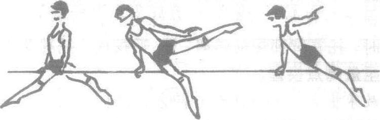 动作要领 由右(左)腿在前的骑撑开始,右(左)手换成反握撑杠,握点在右(左)腿外侧约15厘米处。身体重心向右(左)侧移至右(左)臂上,以右(左)肩为轴,左(右)手迅速推离杠,向左(右)侧转体左(右)腿向侧摆越杠,右(左)腿压杠,以头、肩、胸带动身体转体90°挺身落下成站立。