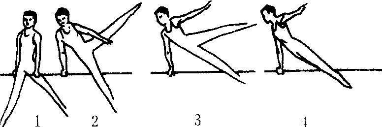 骑撑,后腿向前摆越过杠,同时绕身体纵轴转体90°,成侧对杠的挺身跳下。动作要领:由右手反握,右腿在前骑撑开始。左手推杠,上体向右侧倒,重心移至右臂,右腿后部压杠,两腿同时向左侧摆动。右臂顶肩、撑杠,以头和肩带动向右转体90°挺身落下。保护与帮助:保护者站在杠后右侧方,右手握其右臂,左手托其髋侧帮助挺身跳下。