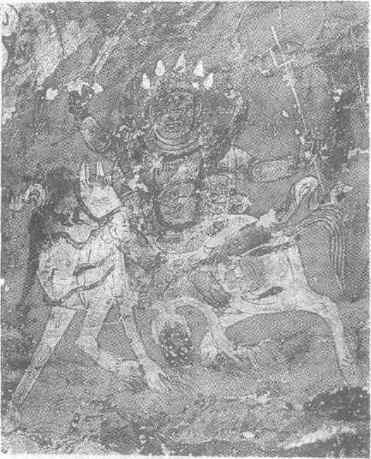 释义 | 骡子天王像壁画 骡子天王像壁画明。纵40厘米。甘肃省永靖县炳灵寺石窟第128窟东壁门内壁画。佛教密宗经典中记载,骡子天王骑一四眼骡子(胯上左右各有一眼),骡子可以飞行,能走遍天上、地上、地下三界。骡子天王生性残暴,被金刚手降服后成为佛的护法神。图中天王体魄雄健,一手持剑,一手挥戟,横眉怒目,口中发出喝叱,威风凛凛。其胯下的骡子正在迈步奔驰并回首后望,可看出是一匹性格暴烈的牲畜。画面以红色为背景,天王赋以黑褐色,以增添气势;骡子则为白色,为画面增添了亮度。画风具有粗犷豪放之美。 ☚ 佛弟子像壁画 牛首天王像壁画 ☛ |