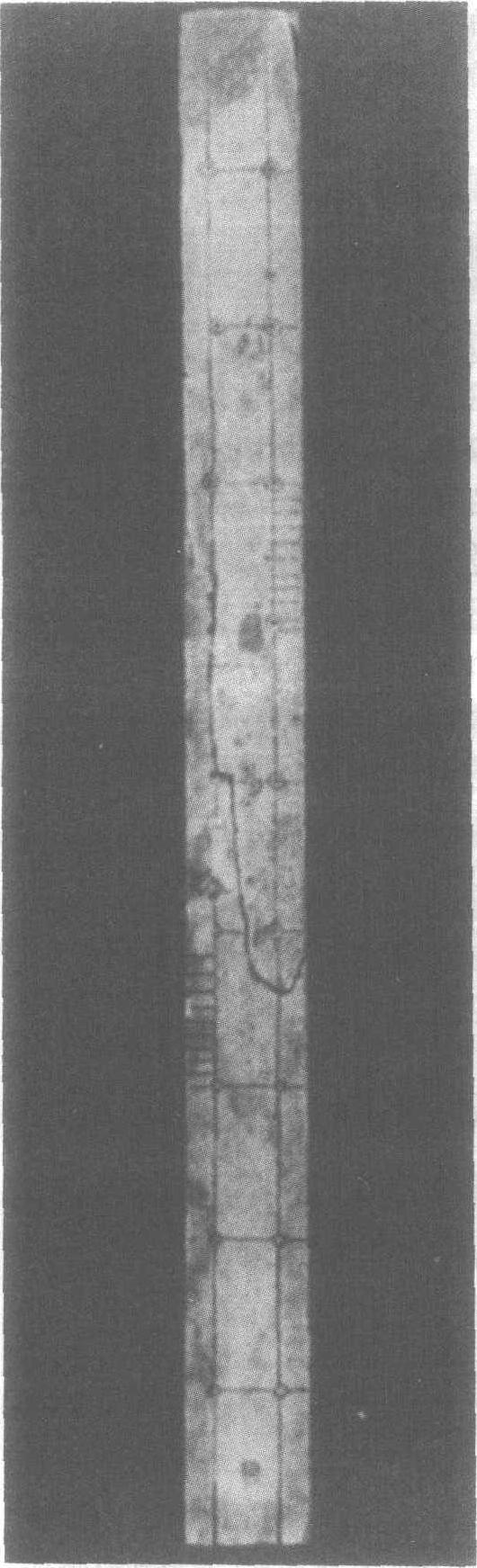 释义 | 古代名物 > 科技類 > 度量部 > 長度測量用具 > 骨尺 骨尺 gǔchǐ 以獸骨所製之尺。《太平御覽》卷八百三十引《魏武上雜疏》:“中宫用物雜畫象列尺一枚,貴人公主有象牙尺三十枚,宫人有象牙尺百五十枚,骨尺五十枚。” 骨尺 骨尺西晋。残长12.7厘米,宽1.5厘米,厚0.6厘米。1954年河南省洛阳涧西22号西晋墓出土。北京中国历史博物馆藏。骨尺出土时两端残缺,存余部分折为三段,现已修复。正、背面用两个圆圈表示寸,以一个圆圈表示半寸。正面二寸半内刻有分。以此尺的三寸长为7.34厘米推算,一尺合24.47厘米。 ☚ 嵌松石饕饕纹夔鋬象牙杯 牙尺 ☛ 骨尺 骨尺东汉末——三国。残长15.2厘米,宽1.85厘米,厚0.15厘米。1955年辽宁省辽阳三道壕1号壁画墓出土。辽宁省博物馆藏。尺为骨质,残存六寸有余,有寸刻度,用星圈表示。五寸处用“十字”的星圈表示尺心,仅第四寸刻有分的细线。经测残存的六寸长14.25厘米,推算当时一尺合23.8厘米。 ☚ 牙骨器 象牙雕饰件 ☛ 骨尺 骨尺商。长16.95厘米。相传河南安阳殷墟出土。江苏省南京博物院藏。此尺用骨制成,已残破;正面用横线纹刻有十寸,第四寸和第五寸处,边缘有残缺,以2寸长3.354推算,一尺合16.95厘米。此尺是所见最早的尺,证明了商周时期我国就采用十进位制,也反映了我国度量衡历史的发展以及我国生产和技术发展的水平。 ☚ 牙骨器 丝织 ☛ 骨尺 骨尺东汉。通长23.7厘米,宽2厘米,厚0.15厘米。1970年河南省洛阳唐寺门东汉墓出土。河南省洛阳市博物馆藏。骨尺等分二段,一段用线纹刻五寸格,未刻分,一段中镂刻有卷枝纹,两边为菱形纹。 ☚ 象牙剑鞘 绘画 ☛ 骨尺 骨尺三国·魏。长23.8厘米,宽1.6厘米,厚0.15厘米。1972年甘肃省嘉峪关新城2号墓出土。甘肃省博物馆藏。尺等分十寸,用两个星圈表示寸,半寸处也有刻度,用一个星圈表示,五寸处中央一个星圈和周围八个星圈组成的圆环作为“尺心”。寸与寸之间的星圈以及每寸之间的星圈用细刻线相贯通。尺端半寸星圈处有一穿孔。 ☚ 牙骨器 骨尺 ☛ 骨尺 骨尺后凉。通长24.2厘米,宽2厘米,厚0.2厘米。1975年甘肃省敦煌文化路4号墓出土。甘肃省敦煌文物研究所藏。骨尺正面用两圆圈表示寸,五寸处刻有三个圆圈,一端有一圆形穿孔,是系绳之用。敦煌文物研究所还藏有一件与此形制、长度相近的骨尺。 ☚ 骨尺 绘画 ☛ |
