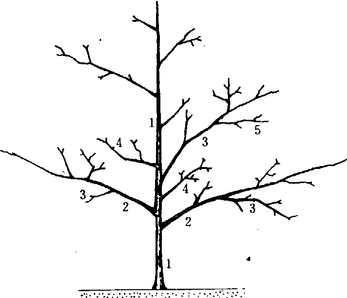 释义 | 骨干枝scaffold limb构成树冠骨架的多年生大枝。包括中心干、主枝、侧枝和副侧枝。在骨干枝上着生小枝和枝组, 共同构成树冠。骨干枝的多少、长短、着生状态, 决定树冠的形状和大小(见图)。 果树树冠骨架结构 1. 中心干; 2. 主枝; 3. 侧枝; 4. 辅养枝; 5. 枝组 侧枝 主枝上分生的二级骨干枝。是着生结果枝组的主要基枝。常依主枝的分布与强弱, 按适当的间距,有序选留。其分枝角度, 一般应大于主枝, 避免与主枝竞争营养, 同时又利于其上枝组形成花芽。第一侧枝距中心干很近的又称把门侧(枝), 容易分散主枝的势力, 又会造成内膛拥挤。盛果期早, 应限制侧枝生长过旺; 成龄大树, 则可以侧枝代替主枝, 以控制树冠大小, 维持树势。 副侧枝 在侧枝上分生的骨干枝。仅在大冠稀植的果树上选留。 骨干枝构成树冠的主要骨架部分的主枝和副主 枝,其数量、着生角度、生长势等与产量有密切关系。 骨干枝从茶树主干、主轴,根颈上产生的粗壮枝条。由根颈、主干上发出的叫“一级骨干枝”;由一级骨干枝上发出的叫“二级骨干枝”。余类推。 |