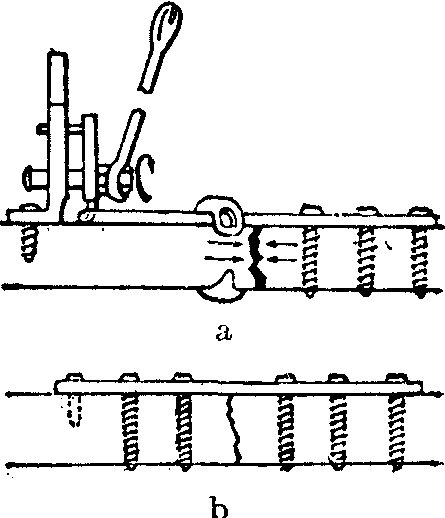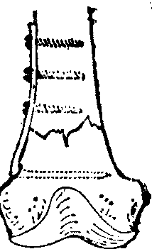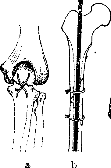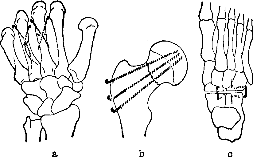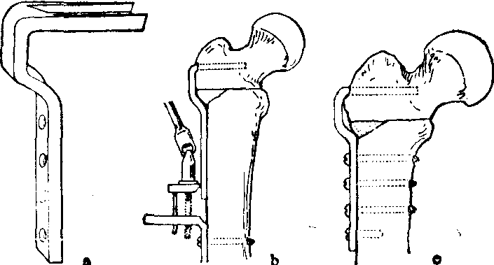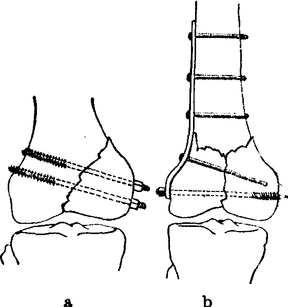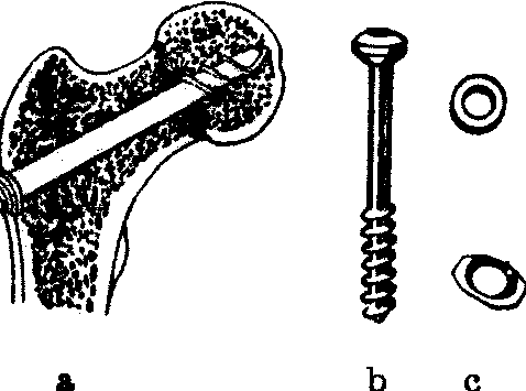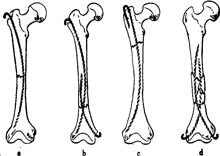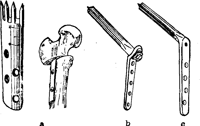 释义 | 骨折切开复位内固定 骨折切开复位内固定切开复位是用手术暴露骨折部位,在直视下进行复位,大多同时作内固定的一种手术方法。切开复位的指征:骨折端之间有软组织嵌入,闭合复位失败者;骨折端相互嵌顿,闭合复位不满意者;关节内骨折需要正确复位者;需要作内固定者。 图1 钢丝内固定 a. 尺骨鹰嘴骨折 b. 股骨干粉碎骨折,钢丝与髓内针联合固定 ![]() 图2 加压螺丝钉内固定 a.股骨颈骨折,加压螺丝钉固定 b. 加压螺丝钉 c. 垫圈 (3)接骨板与螺丝钉内固定: 一般用于固定长骨干骨折,但也有特制的小接骨板用以固定掌骨和指骨骨折;有与三刃钉联合使用,固定股骨转子部骨折;有用两块特制的接骨板固定脊椎骨折,也有制成“L”形接骨板固定股骨髁上骨折(图3)。 接骨板又可分为: ❶通用接骨板,如直板等(图4),均由不锈钢制成。使用目的仅将骨折固定,其长度须为骨折部位骨干直径的5倍,用于股骨者须有6~8孔,胫骨4~6孔,肱、桡、尺骨4孔。 ❷带槽接骨板。使用目的是消除骨折的旋转和成角活动,但容许断端之间有持续的相嵌压缩活动,以促进骨折愈合。但此接骨板并不牢固,也不能达到压缩目的,故已为加压接骨板代替。 ❸加压接骨板。瑞士骨折内固定研究协会A.O.创造的A.O.加压接骨板的形式与通用接骨板基本相同,仅在一个端的洞壁上有一可供加压器钩住的小洞。先用螺丝钉将接骨板固定于一侧骨折段上,再将加压器固定于另一骨折段上,钩住接骨板,拧紧加压器,使骨折断端紧紧压缩。然后将接骨板固定于骨折处,使断端之间维持压缩力,以消除断端上的坏死骨组织吸收后所遗下的间隙(图5)。但此种接骨板需要很长切口,才能置入加压器。为了避免此缺点,又有Hirschhorn加压接骨板的设计。后述的接骨板是从板上的一个槽中加压,因此可以缩短切口长度。 ❹动力性加压接骨板(DCP),这是一种利用特制螺丝钉帽下的斜面和接骨板钉洞的“错配”(Mis-mating)关系而设计的加压接骨板。拧上螺丝钉时,可使断端自动压缩,维持高压。原设计者认为用钴基或钛基合金制成的这种加压钢板手术后可不用外固定而能正常使用伤肢。但实践证明,骨折愈合并不能因此而加速。长期高压内固定反可发生局部骨萎缩,取去接骨板后需用外固定保护,否则可发生骨折。手术并发症相当多见。因此,对加压接骨板的应用还很不一致。 ![]() 图3 “L”形接骨板固定 ![]() 图4 通用接骨板 图5 A.O.加压接骨板 a. 拧紧加压器,使骨端加压 b. 固定后 (4)骨圆针内固定: 骨圆针直径在1.5mm以内者称克氏(Kirschner)针,在1.5mm以上者称斯氏(Stei-nmann)针。开始时主要用于骨牵引,但逐渐发展到作为内固定的器材,用于固定指、掌、跖、胫骨内踝、肱骨髁、尺、桡、肱骨颈、股骨颈等骨的骨折(图6),还可用其制成骑缝钉(staple),固定干骺端骨折,或用于距下三关节融合术的内固定。 (5)三刃钉内固定: 这是治疗股骨颈骨折的有效疗法,不论有无移位或那种类型;都适于用三刃钉固定(图7)。它的优点很多,如接触面积大、体积小、破坏骨质少而固定较牢;三刃形式的抗弯抗折强度很高,又可防止旋转,能有效地固定骨折,术后可不用外固定,起坐活动,三刃钉在X线透视下可用“盲插”法插入,并不需要切开骨折部位,对股骨头和颈的血供损害极小; 横向的骨折线髋部肌肉的张力和收缩使骨折段沿着三刃钉相嵌,而不发生其它方面的活动,对骨折愈合有利。 图6 骨圆针内固定 a.掌骨骨折 b.股骨颈骨折 c. 骑缝钉固定跗间关节融合术 治疗股骨颈骨折的其它内固定物很多。除三刃钉外,尚有加压螺丝钉。 ![]() 图7 三刃钉 (6)截骨钉板内固定: 为了矫正畸形,改变力线,改善功能,解除疼痛,四肢、骨盆和脊柱都可作截骨术。截骨后,常需作内固定,有的可用通用的内固定物,有的因截骨部外形特殊,需用特制的接骨板固定。 图8 非加压钉板 a. 锯齿端制转板固定 b. 可调节式鹅颈钉 c. 固定式鹅颈钉 ![]() 图9 加压截骨钉板 a. A.O.直角叶板 b. 加压 c. 固定后 以股骨近端截骨术为例,钉板的式样很多,可分加压和非加压两大类。常用 ❶非加压钉板(图8),有V形截骨板(jewett plate);锯齿端制转板;Blount叶板;可调节式鹅颈钉(McLaughlin nail); 固定式鹅颈钉(Neufi-eld钉)等。 ❷加压截骨钉板(图9),以Muller设计的A.O.直角叶板(A.O.right-angled blade plate)较为理想,其优点可以正确截骨,保留肢体长度,有效地固定截骨的骨段,术后可不用或短期使用外固定,病人可早期起床活动,避免肺部和泌尿系等并发症,在加压固定下截骨部愈合较快。 (7)骨螺栓固定: 骨螺栓是用较粗的骨圆针制成,全长都有螺纹,贯穿骨折块后,拧上螺帽,可将骨块相互压紧,牢固地维持复位(图10)。骨螺栓内固定适应于胫骨外髁粉碎性塌陷骨折,以及有明显移位的股骨和肱骨髁间骨折等需要正确复位和早期锻炼的骨折。对股骨和肱骨髁间骨折,尚可用Knowles钉固定(图11)。由于Knowles钉较骨螺栓粗,常可不作切开复位,而利用Knowles钉撬拨,在闭合复位后,继续将钉拧入,固定对侧碎片。如仍不够牢固,又可与接骨板联合使用。 (8)髓内针固定: 即用金属长针在髓腔内固定管状骨干骨折的一种手术方法。如器材确当,方法正确,可以牢固地固定骨折,术后可不用外固定,即可早日功能锻炼,达到促进骨折愈合,早日恢复伤肢功能和避免长期外固定所引起的并发症。 髓内针固定的指征和禁忌: 髓内针固定是利用针的一端卡在