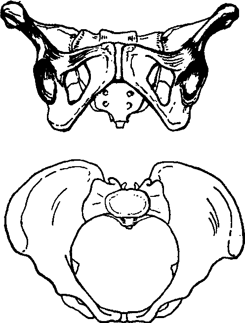 释义 | 骨盆gǔ pén人和脊椎动物中由髋骨、骶骨和尾骨组成的像盆形的骨骼。1880年柯为良译《全体阐微》卷一:“骨盆乃四块合成,式如盆,即钩骨、尾闾骨、左右无名骨。”1919年汤尔和译《诊断学》下卷:“头顶大小可以头顶计(骨盆计)及带尺测其最大径。”◇无名骨、骨盘。 骨盆由左、右髋骨和骶骨、尾骨组成。骨盆在性别鉴定中的重要性占第一位。成人骨盆的性别差异十分明显。男性骨盆高而窄,骨面粗糙,盆腔各径小于女性,坐骨切迹窄而深,耻骨联合高,耻骨下角小,坐骨耻骨支粗壮呈一骨面,坐骨上下支结合部呈三角形,没有腹侧孤,髋骨耳前沟不明显。女性骨盆低而宽阔,骨质纤细光滑,髂翼向外张开,盆腔各径线量度大于男性,坐骨大切迹浅而宽,耻骨联合低,坐骨耻骨支细窄呈嵴状,坐骨上下支结合部呈方形,内下角有孤形骨嵴出现,耳前沟明显,耻骨下角大于90°角。此外,骨盆髂骶关节面(耳状面)及耻骨联合面的形态学改变,均是年龄鉴定的主要依据。 骨盆 骨盆也属女性内生殖器的一部分(见图6.1-3)。它是胎儿娩出时必经的通道。其大小、形状对分娩有直接影响。骨盆是由骶骨、尾骨及左右两块髋骨所组成。每块髋骨又由髂骨、坐骨及耻骨融合而成。 图6.1-3 正常女性骨盆(前上观) ☚ 输卵管 6.2 女性生殖系统生理 ☛ 骨盆 骨盆gupen由左右髋骨、骶骨、尾骨和韧带构成的环状骨架。为人和哺乳动物所特有。骨盆由骶骨岬、弓状线、耻骨梳和耻骨联合上缘所组成的界线,分为上方的大骨盆和下方的小骨盆。小骨盆有上下两口,上口为骨盆入口,由上述界线围成,下口为骨盆出口,由尾骨、骶结节韧带、坐骨结节和耻骨弓围成。两口之间的空腔为骨盆腔。男女骨盆的形态差别较大。一般男性骨盆腔高而狭窄,形似漏斗。女性骨盆低而宽阔,呈圆桶状。其上面入口和下面出口也较宽大并呈圆形,是胎儿娩出的通道。人类骨盆可支持体重和保护盆部内脏,且与直立行走相适应。 ☚ 脊柱 肋骨 ☛ 骨盆 骨盆gupen由髋骨、骶骨、尾骨及其周围的韧带组成的结构,主要的功能是容纳并保护盆腔脏器——直肠及泌尿生殖器官等。男、女性骨盆在形态上有很大差异,男性骨盆狭而长,女性骨盆宽而短,女性骨盆的形态特点与分娩功能有关。(王 雁)腕 (wan) 前臂与手连接的部位,又称手腕。由8块腕骨组成:头骨、钩骨、三角骨、大多角骨、小多角骨、月骨、豆骨、舟状骨。8块腕骨之间构成关节面,因此腕部的活动非常灵活,能作背屈35°~60°,掌屈50°~60°,尺侧倾斜30°~40°和桡侧倾斜25°~30°等动作。 ☚ 胸廓、足弓 骨骼肌 ☛ 骨盆pelvis由左右髋骨、骶骨、尾骨以及所属的韧带构成一盆形结构,叫骨盆。又可分为大骨盆和小骨盆两部分,两者界线为自骶骨岬向两侧,经弓状线、耻骨梳及耻骨联合上缘,大骨盆位于此线上方,较宽大;小骨盆位于此线下方,为逐渐狭窄的管腔,此腔称小骨盆腔。小骨盆有上、下两口:骨盆上口即由上述界线围成,骨盆下口由尾骨、骶结节韧带、坐骨结节、坐骨下支、耻骨下支以及耻骨弓状韧带围成。人的骨盆承受身体的一定重量,尤其站立时(站立时骨盆有一定的倾斜角度)。骨盆男、女之间有很大差异:女性骨盆入口呈椭圆形,男性呈心形;女性骨盆出口宽大,男性较小;女性耻骨联合短而宽,男性长而窄;女性耻骨弓角为80~100度,男性为70~75度等。女性骨盆诸多径线大小及骨盆形态、异常等对胎儿分娩有重大意义。骨盆疾病,以骨折为多见。 骨盆由骶骨、尾骨及左右两块髋骨和所属的韧带构成的一盆形结构。可承受腹腔内脏压力,支持身体一定的重量。上面有入口,下面有出口。两口之间称骨盆腔。男女之间有很大差异,男性小而窄,女性宽而浅,有利于胎头入盆和胎儿娩出。如果骨盆有畸形和狭窄,可造成分娩因难。 骨盆pelvis由骶骨、尾骨及左、右髋骨及其间的连结而成。骨盆以界线分为上部的大骨盆和下部的小骨盆。大骨盆后壁由第5腰椎及两侧髂骨翼组成,前壁开放由腹壁软组织填充。小骨盆又分上口(界线)、下口及盆腔三部分。盆腔为一短而弯曲的骨性腔隙。其后壁为骶、尾骨的前面; 侧壁为髋骨及骶结节与骶棘韧带; 前壁短,为左、右耻骨; 联合面借耻骨间盘等相连结。界线由骶岬、弓状线、耻骨梳、耻骨联合上缘围成。 骨盆 骨盆骨盆是由骶骨、尾骨和左右两髋骨连结围成的骨性环。男性直立时,骨盆两髂前上棘和耻骨联合位于同一冠状面内;在女性,其髂前上棘更前倾约1cm。骨盆既将体重传递到两下肢,并作为游离下肢的活动基础,又支持保护腹盆内器官。骨盆的连结主要是耻骨联合和骶髂关节(见“耻骨联合与骶髂关节”条),此外,尚有一些重要韧带,即: 上图: 女性骨盆(前面观) 下图: 女性骨盆(上面观) 骨盆有明显的性别差异,因女性骨盆与孕育胎儿及分娩密切相关。男女性骨盆的差异主要存在于小骨盆,大骨盆也有相应的表现: ❶女性骨盆较男性者小而较轻;肌、腱和韧带附着处的标志不及男性者明显;骶骨底,耳状面和髋臼都较小,耻骨联合也较宽而短。 ❷女性骨盆上口、下口的横径与矢径的绝对值比男性者为大;因女性的耻骨体与耻骨嵴较长,故髋臼至耻骨联合的距离比髋臼本身的直径为大;耻骨弓的夹角约为90°或更大些,而男性者约为70~75°;女性的坐骨结节稍翻向外侧,坐骨大切迹的夹角较大,因而尾骨更偏向后方,骶骨的嵴也不及男性者显著