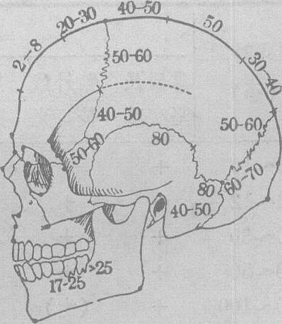 年龄鉴定 主要根据各颅缝愈合情况,下颌骨形状变化,乳牙、恒牙发生顺序,牙齿脱落磨耗以及齿槽萎缩程度等。目前对此只能作出粗略的估计。 由颅骨推断年龄: 颅缝一般随年龄的增长而逐渐愈合,愈合的次序及程度有助于推测年龄。由于个体差异甚大,它并不是鉴定年龄的良好指标,但如仅有颅骨而没有其他骨胳参照时,就只能据此作出推断。颅缝的形状大部分呈复杂锯齿状的弯曲,颅缝愈合时弯曲减少。但矢状缝及冠状缝的交点(bregma)处,线段较少弯曲,同样矢状缝近顶孔的线段以及人字缝的下段亦少弯曲。不应当将这种特点误认为是锯齿消失、愈合开始。每条缝愈合与不愈合之间可按不同程度分为五级: Ⅰ级,未愈合;Ⅱ级,轻微愈合;Ⅲ级,部分愈合;Ⅳ级,大部分愈合;V级,全部愈合。各年龄各主要颅缝愈合情况归纳如表。 各年龄主要颅缝愈合程度