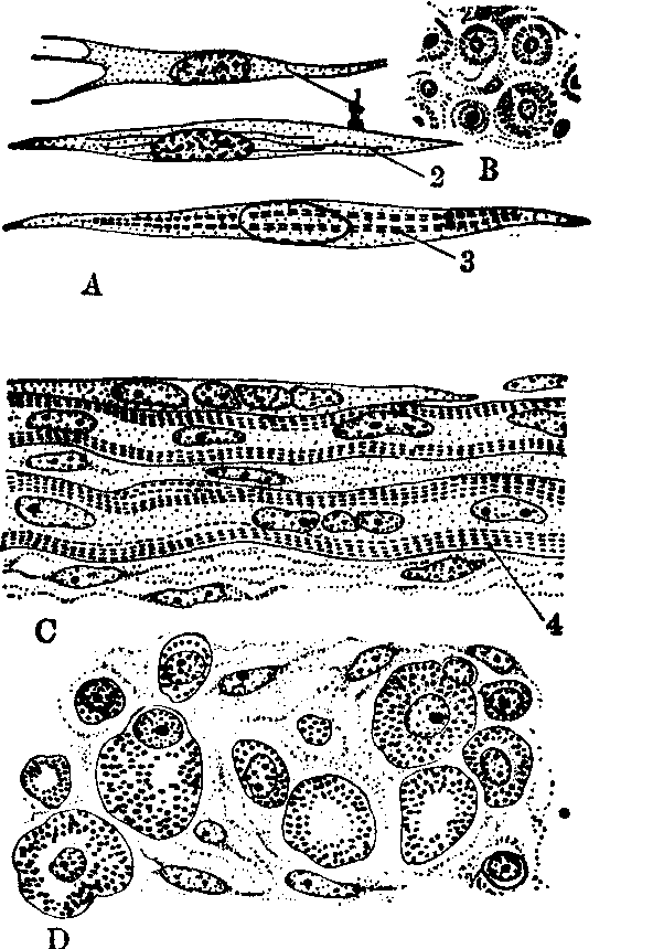 释义 | 骨胳肌的组织发生 骨胳肌的组织发生无论来自生肌节的细胞或有同样潜能的间充质细胞,其组织发生是相同的。从原始的细胞分化为成熟的肌纤维(即肌细胞),一般经过四个时期: 前成肌细胞,成肌细胞、肌管细胞和肌纤维。前成肌细胞为稍长的不规则星状细胞,含少量胞质,有一个大而圆的核,染色质深,核仁明显。进一步分化时,细胞增大并伸长为梭形,胞质增加,含有较丰富的核朊粒和散在的肌微丝,核为椭圆形,染色质淡,核仁明显,此为成肌细胞,它仍具有继续分裂增殖的功能,并由核朊粒不断合成肌微丝,许多肌微丝组成肌原纤维,最先有少量出现在细胞周边区,排列分散,较粗,但尚未见横纹,在后期,部分成肌细胞由数个融合在一起构成合胞细胞,呈管状形,即为肌管细胞,它失去了再分裂的能力(用thymidine 3H示踪说明无DNA合成)。尚存在的成肌细胞可继续加添到管状肌细胞内,使长度和宽度增加。以后,细胞质内肌原纤维越来越多,从周边逐渐向中央填充,核被挤向周边。肌原纤维在一定间隔出现规律的双折光物质的暗带(A带)和单折光物质的明带(I带),使肌细胞内表现出明、暗交错的横纹。不久在暗带中出现H带和M线,明带中出现了Z线,最后,每一肌管细胞分化为一条长圆筒状的肌纤维(见图)。有的学者认为肌纤维是由于在发育过程中经过核的多次分裂,其本身并不分裂,从而形成了多核的肌纤维。 骨胳肌的组织发生,示成肌细胞的演变 A.成肌细胞(8~9周) B. A的横切面 C.具有横纹的肌纤维(5月) D.C的横切面 1.核朊粒 2.肌微丝 3.肌原纤维 4.横纹 ☚ 骨胳肌的发生 骨胳肌的异常发生 ☛ |