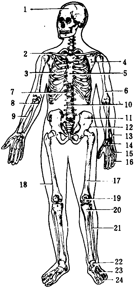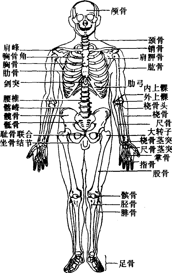 释义 | 骨骼gǔ gé动物的骨架子。杜甫《瘦马行》:东郊瘦马使我伤,骨骼硉兀如堵墙。 骨骼ɡǔɡé❶人或高等动物全身骨头的总称。 骨骼gǔgé〈名〉人和动物体内或体表坚硬的组织,由多块骨头组成:内骨骼。 骨骼guge人或动物体内或体外坚硬的组织。分骨骼和外骨骼两种。通常单指内骨骼:医务室里放着一副人的~|恐龙博物馆里展出许多恐龙~。 文章各部 文章各部诗文的开头:首面 凤头 ☚ 文章 文章各处 ☛ 骨头 骨头骨(~质;~膜;体~;身~;躯~;蝶~;颞~;锁~;肱~;尺~;挠~;腕~;掌~;指~;椎~;肋~;骶~;髋~;盆~;股~;膑~;胫~;腓~;跗~;跖~;趾~;软~;长~;肩胛~)骸 骼 另见:肌肉 皮肤 支撑1 尸体 ☚ 骨头 各部的骨 ☛ 骨骼 骨骼成人的骨共有206块(见图1.3-1)。每块骨都有一定的形态,有的长、有的扁、有的形态不规则。骨主要由骨质构成,外面包以骨膜,内部有骨髓、还有神经和血管。骨质分为两种,一种为骨密质,分布在骨的外层,另一种为骨松质,分布在骨内部。以四肢长骨(见图1.3-2)为例:长骨两端膨大部分为骨骺,外面是一薄层骨密质,内部由骨松质组成;长骨骨干部由骨密质组成,内部管样的空腔为骨髓腔,内有骨髓;骨膜包在骨的外面,结构致密,紧贴在骨的外面,对骨的生长和发育均有重要意义,在骨折时还可促进骨的愈合。男女之间骨骼有一定的差异,女性骨盆宽大,是体内性激素不同所形成的。 图1.3-1 骨 骼 图1.3-2 骨的构造 ☚ 运动系统的组成和功能 关节 ☛ 骨骼 骨骼guge许多骨借骨连结连在一起形成坚硬的骨架叫做骨骼。位于体内称“内骨骼”,如人和脊椎动物的骨骼。与位于体外称“外骨骼”(如虾、蟹、昆虫体表的几丁 质硬壳) 不同。人体骨骼分为头骨 (又叫颅骨)、躯干骨和四肢骨三部分,构成身体的支架,共由206块形状不同的骨组成,能维持体形,支撑体重和保护内部器官。根据形状不同,一 般可分为长骨、短骨、扁骨和不规则骨四种。骨的形态可因生活条件、习惯、劳动性质及是否发生某些疾病而发生 一定改变。在儿童和青少年时期,要根据年龄、性别和健康状况,进行适宜的体育锻练,注意保持正确的坐、立、行的姿势,这样可以促进骨骼良好发育。 ☚ 运动系统 骨 ☛ 骨骼 骨骼guge由骨和骨连结构成的人体的支架(见图)。分颅骨、躯干骨和四肢骨三个主要部分,共计206块。骨骼的主要功能是构成人体的基本轮廓,并能支持体重,保护人体内部的重要脏器,如心、脑等。另外,配合肌肉完成各种运动。成人全身骨占体重的20%。骨的大小不同,形态多样,按形态大致可分为长骨、短骨、扁骨和不规则骨四类。长骨分布于四肢,起支持和杠杆作用;扁骨围成空腔,对腔内器官起保护作用。成人骨组织中约含三分之二矿物质(主要是钙和磷)和三分之一有机物。矿物质和有机物结合起来,使骨既坚硬又具有一定的弹性。骨的化学成分随着年龄的增长而变化,儿童和青少年时期,骨组织中有机物含量较多,故弹性大,硬度小,可塑性强,易变形。老年人则相反,有机物含量少,无机物含量相对增多,故弹性小,脆性大,易发生骨折。 骨骼 ☚ 体温调节 骨髓 ☛ 骨骼skeleton系运动器官的支架部分。人体骨骼是由206块骨,借连接组织相连而构成。对人体起支柱、运动和保护作用。206块骨:颅骨23块、躯干骨51块、四肢骨126块、听骨6块。骨的形状、大小不一,大致分为长骨、短骨、扁骨、不规则骨和含气骨5种。各种骨的功能亦不完全一致。骨由密质和松质2部分构成,骨外包被骨膜,对骨有营养等作用。骨除有支架作用外,还有造血功能。骨的疾病种类甚多:以外伤骨折为多见;其次为骨髓炎、增生性疾病、关节疾病、肿瘤等;造血疾病列入血液疾病范围。 骨骼 骨骼Guge由骨借助于关节囊和韧带连接在一起构成的。成年人共有206块骨,多数是成对的。人体骨骼按其所在部位可以分为中轴骨和附肢骨。 ☚ 运动器系 骨化 ☛ 骨骼人体的支架。由全身骨连结构成。骨所围成的颅腔、胸廓和盆腔,支持和保护脑、胸腔及盆腔内的重要脏器。骨骼肌附着于骨,通过关节,收缩时牵动骨,使骨改变位置而产生运动,在运动中骨起杠杆作用。 骨骼skeleton系支持人和动物体形,保护内部器官,供肌肉附着和作为肌肉运动杠杆作用的支架部分。人体骨骼有206块骨,借连结组织相互连结。206块骨分有颅骨23块,躯干骨51块、四肢骨126块、听骨6块。骨的形状、大小不一,可分为长骨、短骨、扁骨、不规则和含气骨五种。其功能各有异同(图)。 人体全身骨骼 骨骼osseous framework |