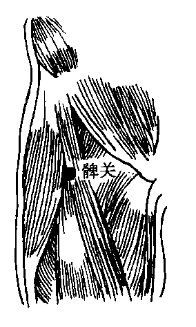 释义 | 古代名物 > 人體類 > 四肢部 > 經穴 > 髀關 髀關 bìguān 足陽明胃經穴。髀,髀骨,即股骨;關,指關節。因其在髀骨上端關節處,故名。主治下肢麻木,小腹攣痛。始見於秦漢典籍,達於當代。《靈樞經·經脈》:“胃足陽明之脈……以下髀關。”晉·皇甫謐《針灸甲乙經》卷三:“髀關,在膝上伏兔後,交分中。刺入六分,灸三壯。”清·廖潤鴻《針灸集成·足陽明胃經》:“髀關……主治腰痛膝寒,足麻木不仁,黄癚,痿痹,股内絡急,小腹引痛。” 髀关❶经穴名,代号ST31。出 《灵枢·经脉》。属足阳明胃经。位于大腿前外侧,髂前上棘与髌骨外缘的连线上,当缝匠肌外侧,与会阴平高处; 或于髌外上12寸处取穴(《类经图翼》)。另说“在伏兔后交分中” (《针灸甲乙经》,“伏兔后,骻骨横纹中” (《医学入门》); “约伏兔后一寸许” (《循经考穴编》广注)。布有股外侧皮神经,深层有旋股外侧动、静脉分支通过。主治腰、髋、股、膝痛,下肢屈伸不利、麻痹或瘫痪; 以及股外侧皮神经炎等。直刺1~1.5寸,艾炷灸3~5壮; 或艾条灸5~10分钟 (图136)。 图136 髀关指股部的前上方。 髀关Pikuan系足阳明胃经上的一个针炙穴位。取穴:屈股,髂前上嵴与髌骨上缘连线上,与承扶相对取之。施针时直刺1~2寸。主治风湿痛、瘫痪、下肢麻痹等。 髀关bìɡuān经穴名。代号ST31。出《灵枢·经脉》。属足阳明胃经。位于大腿前外侧, 髂前上棘与髌底外侧端连线上, 屈髋时平会阴, 居缝匠肌外侧凹陷处。主治腰、膝、髋、股痛, 下肢麻痹或瘫痪, 股外侧皮神经炎等。直刺1 ~1. 5 寸。灸3 ~5 壮或5 ~10 分钟。 髀关 髀关S31Biguan足阳明胃经穴。首见《灵枢·经脉》。位于髂前上棘与髌底外侧端连线上,与臀沟平高处。或以髌底外侧端上12寸定位。正坐或仰卧取之。简便取穴,以手掌掌后第一横纹中点按在髌底中点处,手指并拢押在大腿部,中指尖所到处作一标记; 再以手掌掌后第一横纹中点按在标记上,手掌平伸向上,中指端到处是穴。相当于缝匠肌与阔筋膜张肌之间;深层有旋股外侧动、静脉分支; 并有股外侧皮神经。 ☚ 气冲 伏兔 ☛ 髀关bì guān❶upper anterior portionof thigh |