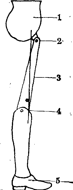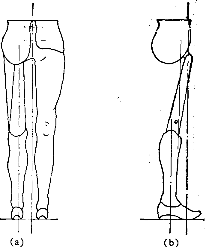 髋关节离断假肢的结构: ❶踝关节和假脚: 踝关节为固定式,假脚用木材和聚氨酯微孔橡胶或毛毡制成,后跟有软垫,结构简单轻便,称SACH (Solid Ankle CushianHeel)假脚。 ❷膝、髋关节: 主要作用是在支撑期保持关节稳定,摆动期关节伸屈自然。目前多采用单轴膝、髋关节。膝、髋关节之间连有松紧带,使两关节易处于中立位。 ❸接受腔: 接受腔包容残体,下连人工关节,行走时靠腰部扭动带动接受腔,使假肢运动形成支撑期和摆动期而移动身体。假肢位于支撑期时,坐骨结节为主要承重部位,残体末端的软组织也分担部分体重,摆动期时,靠接受腔上端卡在两侧髂嵴处起悬吊作用。接受腔上缘不可过高,以免妨碍弯腰; 下缘避免过长,防止坐下时挤压腹股沟; 腹部不宜压迫过紧,以免妨碍呼吸(尤其是男性)。 对线 (Aligment) 分为静态对线和动态对线。静态对线是利用装配仪确定接受腔、各机械关节和假脚之间的空间位置;动态对线是截肢者穿戴假肢后,在站立、起坐和行走过程,检查、调整以上各部位之间的位置,使之站立稳定和步态自然。静态对线时,从侧面看各关节的关系如图2-b所示: (1) 过髋关节轴心的垂线,位于假脚的跖趾关节略偏后处。 (2) 膝、踝关节轴心位于同一垂线上。 静态对线从前面看各关节的关系如图2-a所示:
