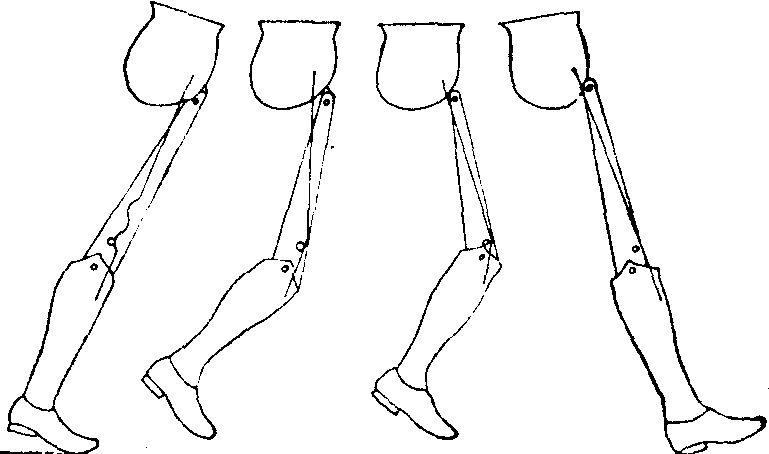 (1) 各机械关节宽度的中点都在同一垂线上。 图3 步态分析 (2) 两腿相对于体中线左右对称。 步态分析(图3) 穿着髋关节离断假肢在平坦的地面上行走,当健侧脚跟着地时,假脚蹬离地面,假肢由支撑期进入摆动期,机械髋、膝关节处于伸位,在腰部扭转和手杖的支撑下肢摆向前方,髋关节由伸位变为中立位,膝关节由中立位变为屈曲位,松紧带被拉紧。当假肢继续向前摆动时,髋关节由中立位变为屈曲位,小腿靠惯性向前摆动,由于松紧带的收缩力,使膝关节由屈曲位恢复为中立位,脚跟着地时,假肢由摆动期转入支撑期。 ☚ 大腿假肢 假眼 ☛ |