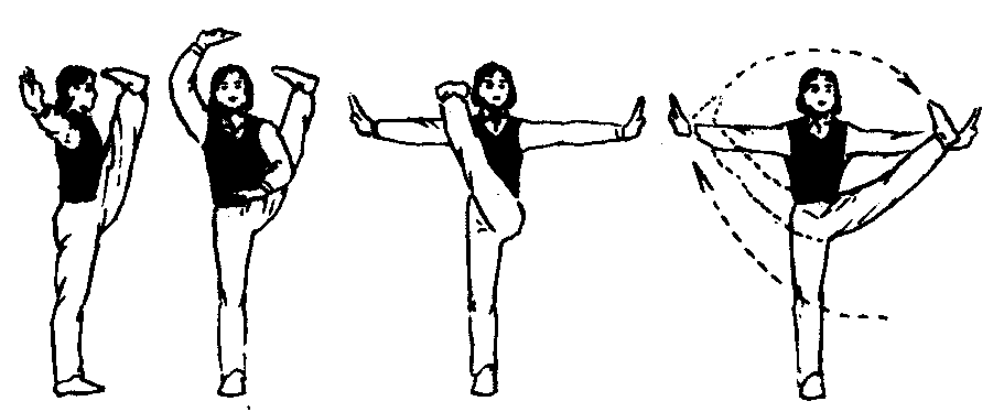 释义 | 髋腿练习 髋腿练习以髋关节为轴的腿部练习。其主要练习类型有踢、压、耗、摆、劈叉等。踢有正、侧、蹁、十字等。正踢腿:上体正直,两腿伸直,脚踢向眼眉处,落下成直立,根据需要勾脚或蹦脚。(图2—3—3)侧踢脚:脚从身体的侧面踢向耳侧,髋关节充分外展。后踢腿:大腿根用力,上体正直。十字踢脚:脚踢向异侧太阳穴处。蹁腿:右腿向左经上再向右划弧成站立。压腿有正压、侧压、后压等,压腿时被压腿搁置在一定高度的器械上,两腿伸直。正压腿:上体正直前下压、勾脚。侧压腿:背部挺直,上体侧屈下压,不前倾后仰。后压腿:支撑腿直或屈均可,肩要正,上体后屈时挺胸腹。耗腿:是压腿的前奏,把脚放置在一定高度上,两腿伸直,上体正,保持正确的身体姿势静止片刻。摆腿:两手可扶持器械,进行前后、左右的钟摆式摆动。劈叉:分前后劈叉(纵劈叉),左右劈叉(横劈叉)。前后劈叉:两腿伸直前后分,前腿的后部和后腿的前部着地,上体正直下压。左右劈叉:两腿伸直左右侧分,上体正直,压时可前屈。老年人通过以上髋腿练习增强盆带肌、大腿及小腿肌群的弹性和力量,提高髋关节的灵活性和关节周围韧带的柔韧性。由于老年人的生理特点,肌肉和韧带的弹性下降,因此进行髋腿练习时一定要注意身体情况,切不可操之过急,否则容易发生拉伤,甚至撕裂。练习前,要进行适当的活动如慢跑、快走等使身体发热,练习顺序应先耗后压再踢腿,用力由小到大,动作规格由低到高,逐步使动作达到正确要求,取得最佳效果。