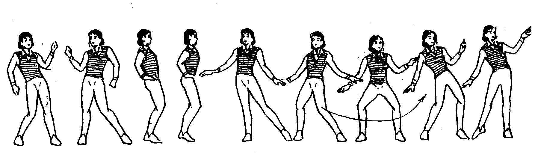 原地顶髋分腿站立预备。1~2向左顶髋,右腿屈膝内扣,上体保持正直,两臂于体侧自然摆动;3~4同1~2,但方向相反;5~6向前顶髋,稍含胸,两手扶髋;7~8向后顶髋,挺胸,两手扶髋。要求:顶髋时,主要是髋部运动,身体其它部位保持不动,练习时可结合手臂动作移动和变换节奏。