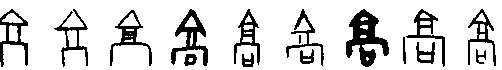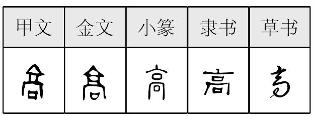 高 甲骨文; 金文; 篆gāo[京(省形,意符)+口(聲符)→高(《説文》:“高,崇也。象臺觀高之形。從冂,口與倉、舍同意。”高,初文像築于高丘上的房屋,古人擇高地建屋而居,因當時低處常遭水患。高,從下向上的距離〈高度〉,從下至上的距離大〈高空〉。引申爲大〈高喉嚨、大嗓子〉,超標準〈高溫、高血壓〉,歲數大〈高齡、高夀〉,族中長者〈高祖〉,尊貴〈高親、高鄰〉,道德水準在一般之上〈高尚〉;“高”與“矮”相對;姓。)] 《詩經·小雅·十月之交》:“高岸爲谷,深谷爲陵。”(高岸陷爲深谷,深谷變爲丘陵。:所記像是一場大地震。) 高(ɡāo)“ ,崇也。象台观高之形。从冂,囗与仓、舍同意。凡高之属皆从高。”(古牢切) 徐锴《系传》:“按《易》曰:‘崇效天,卑法地。’崇,高。囗音韦,与仓舍同意,谓皆室屋垣墙周帀之意。” “高”是个象形字,甲骨文 ,金文 ,皆象台观高大之形。甲骨文中多用为远义,如“高且(祖)”即远祖。战国包山楚简作 。战国文字“高”可用为高低之高,如秦青川木牍:“道广三步,封高四尺,大称其高。”[1]许慎以“崇”释“高”,是同义互训。说“囗与仓、舍同意”意思是粮仓和屋舍都有窗。 高部有三个属字。如“亭”字,云:“民所安定也。亭有楼。从高省,丁声。”“亳”下云:“京兆杜陵亭也。从高省,乇声。”后来的辞书中,《康熙字典》、《辞海》、《辞源》中都立“高”部。“高”可以作声符,如“稿”、“篙”、“槁”、“缟”等。 高gāo(10画)