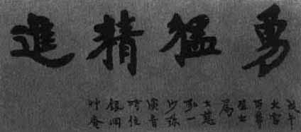 释义 | 勇猛精进横披 【简介】: 近代·弘一法师书于戊午年(1918)。纸本。刊于《中国书法》一九八六年第四期。 【赏析】: 弘一大师是民国七年(1918)秋剃度出家的,冬天写了这幅横披赠送给好友夏丏尊。“勇猛精进”爲《华严经》句,书用魏碑体。他出家前对书法是下过苦功的,篆隷草眞各种碑版法书都临摹,似乎对魏碑下的功夫最多。这幅字点画结体不求似某一碑誌,而是出于己意,用笔逆涩迟重,庄严而端厚,字形向前倾侧,透露出法师皈依宗敎时排除一切、矢志不回的决心。 |