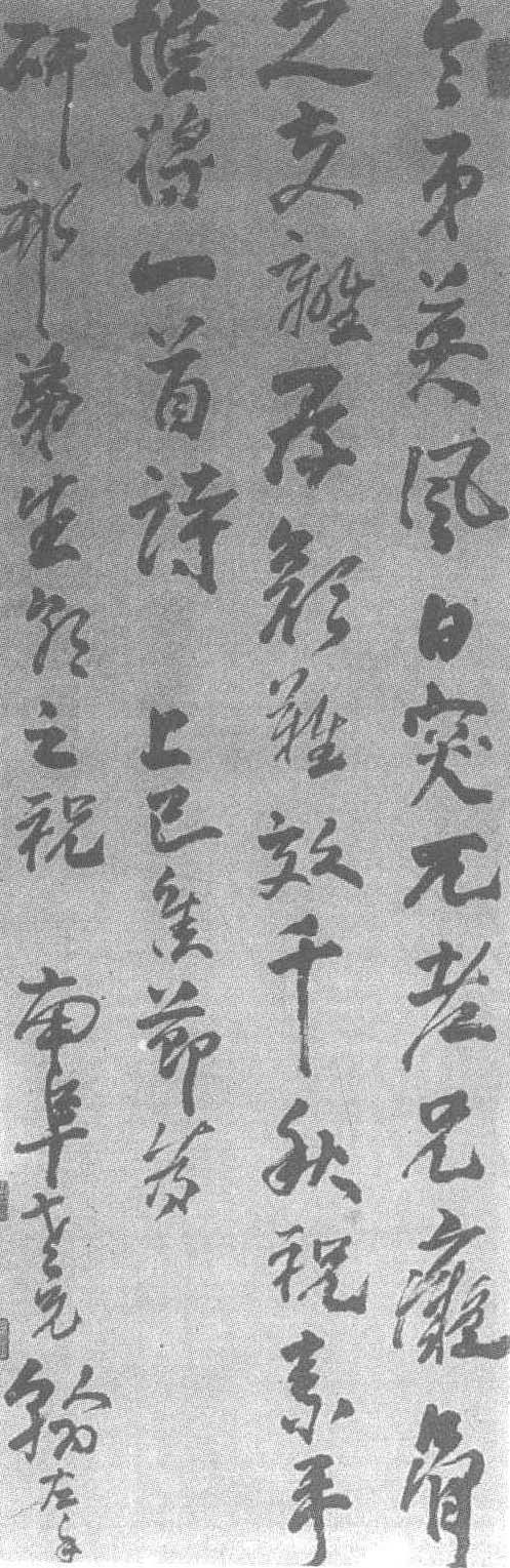 清。纸本。纵138.5厘米,横47.9厘米。上海博物馆藏。高凤翰(见《高凤翰行书西亭睡起诗轴》条目)书。此书七言绝句:“令弟英风日突兀,老兄痴骨久支离,厚颜难效千秋祝,素手惟将一首诗。”款署:“上巳佳节为研村弟生朝之祝,南阜老兄翰左手。”款下钤白文<高凤翰印>、朱文<西园>印,起首钤朱文<深柳读书堂>印。此幅行书是为研村生朝所作的七言绝句,未署年款,通篇为高凤翰左手写成,中锋行施,用笔起落凝重苍古,笔画自然圆畅,使转顿挫抑扬,章法布局严谨有致,古朴浑厚,气韵生动自然。