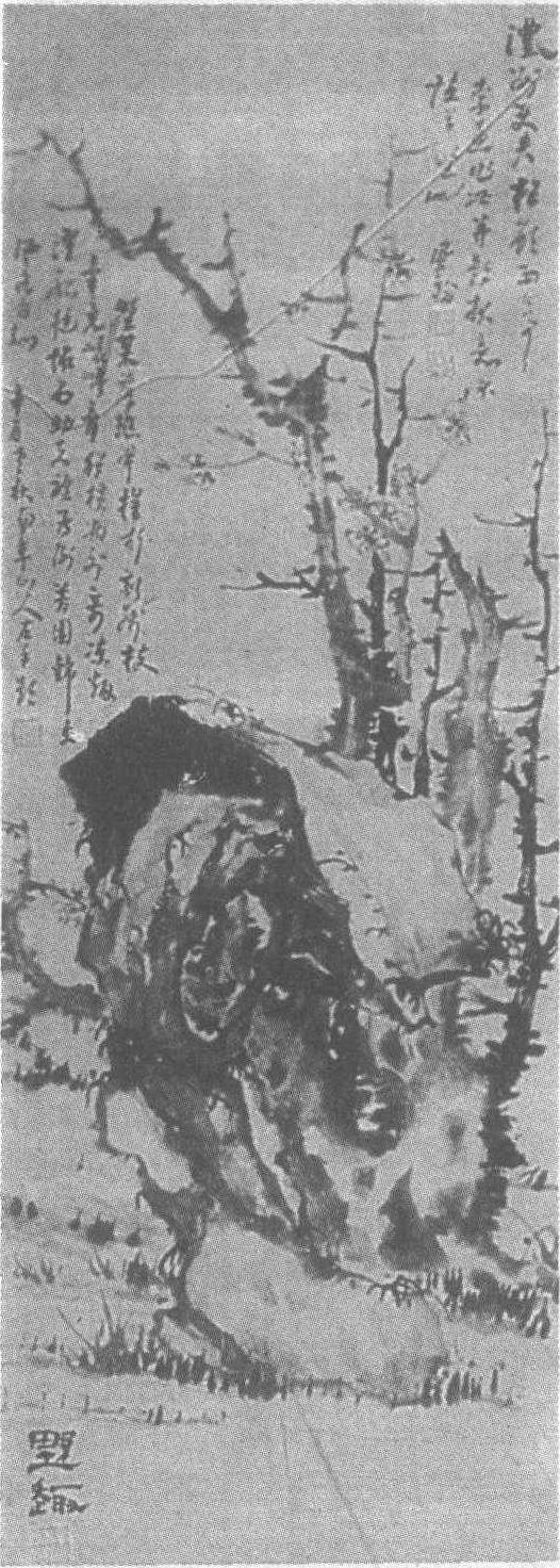 释义 | 高凤翰野趣图轴 高凤翰野趣图轴清。高凤翰(见《高凤翰山水图册》条目)绘。纸本墨笔。纵123厘米,横45厘米。山东省博物馆藏。此幅画奇石兀立,石后寒梅数株,花朵疏落。黑色润而不薄,老而不滞,处理得恰到好处。用笔刚柔清劲,纵横恣肆,勾勒皴擦,意到笔至,一气呵成。整幅作品气势磅礴,充满奇逸野韵。画面上方左右题识与梅石浑然一体,相得益彰。左下方又以隶体自题“野趣”二字,老辣凝重,与画风相谐,似为点睛之笔。款署辛酉,即公元1741年。高氏晚年多作写意,并能自出新意,此幅画虽充满苦寒之气,却给人一种挺拔向上、刚正倔强之感。 ☚ 高凤翰山水图册 潘恭寿重岩暮蔼图轴 ☛ |