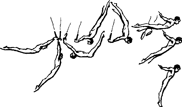 吊环低难度下法之一。未列入国际规则的难度表。但早在1936 年奥运会上曾选入规定动作中,以后,还多次选为奥运会规定动作的下法。由于此动作的技术与直体后空翻相近,所以也可称为直体分腿后空翻下。由于动作技术的发展已与一般的分腿后空翻下有所变化。也可以讲是分腿后空翻下的一个变化。动作是从悬垂前摆开始,下摆到垂直部位振浪沉肩兜腿后,两腿上摆,此时稍屈髋分腿梗头,两臂用力拉环引体,使身体向上抛起,当身体上升到环上时放手,接着抬头挺身,飘然落地。这一动作与一般的后空翻下动作的区别在于有较长时间的拉环引体和能使身体腾空较高。正因有此作用,所以可作为一些后空翻下动作的辅助练习。初学时,可在低吊环上在保护和帮助下做慢动作,体会动作的整个过程、动作技术和用力方法。也可在中等高度吊环上帮助完成动作。教练员应在运动员拉环时托肩,控制身体上升的方向和提高腾空高度。一般情况下更多的是在海绵坑中进行练习。