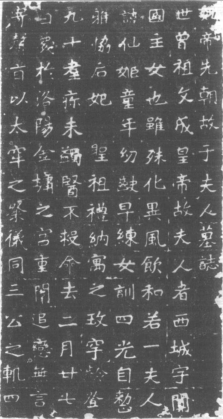 释义 | 高宗夫人于仙姬墓志亦稱〈魏帝先朝故于夫人墓志〉、〈文成皇帝夫人于仙姬墓志〉。北魏·孝昌二年 (526)四月刻。正書十三行,行十五字。蓋正書題“大魏文成皇帝夫人于墓志銘”三行十二字。夫人乃于闐國主之女,終年九秩。是書刻于界格内,楷法整然,書風渾樸,趣致濃鬱,别具一格。民國十五年(1926)河南洛陽南山石村出土,嘗歸三原于氏。趙萬里《漢魏南北朝墓志集釋》縮印輯入。有翻刻本。 高宗夫人于仙姬墓志銘 (局部) |
