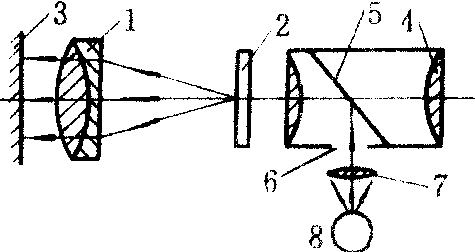 1—物镜;2—叉丝; 3—平面镜;4—目镜; 5—分光板;6—小孔;7—聚光镜;8—光源。